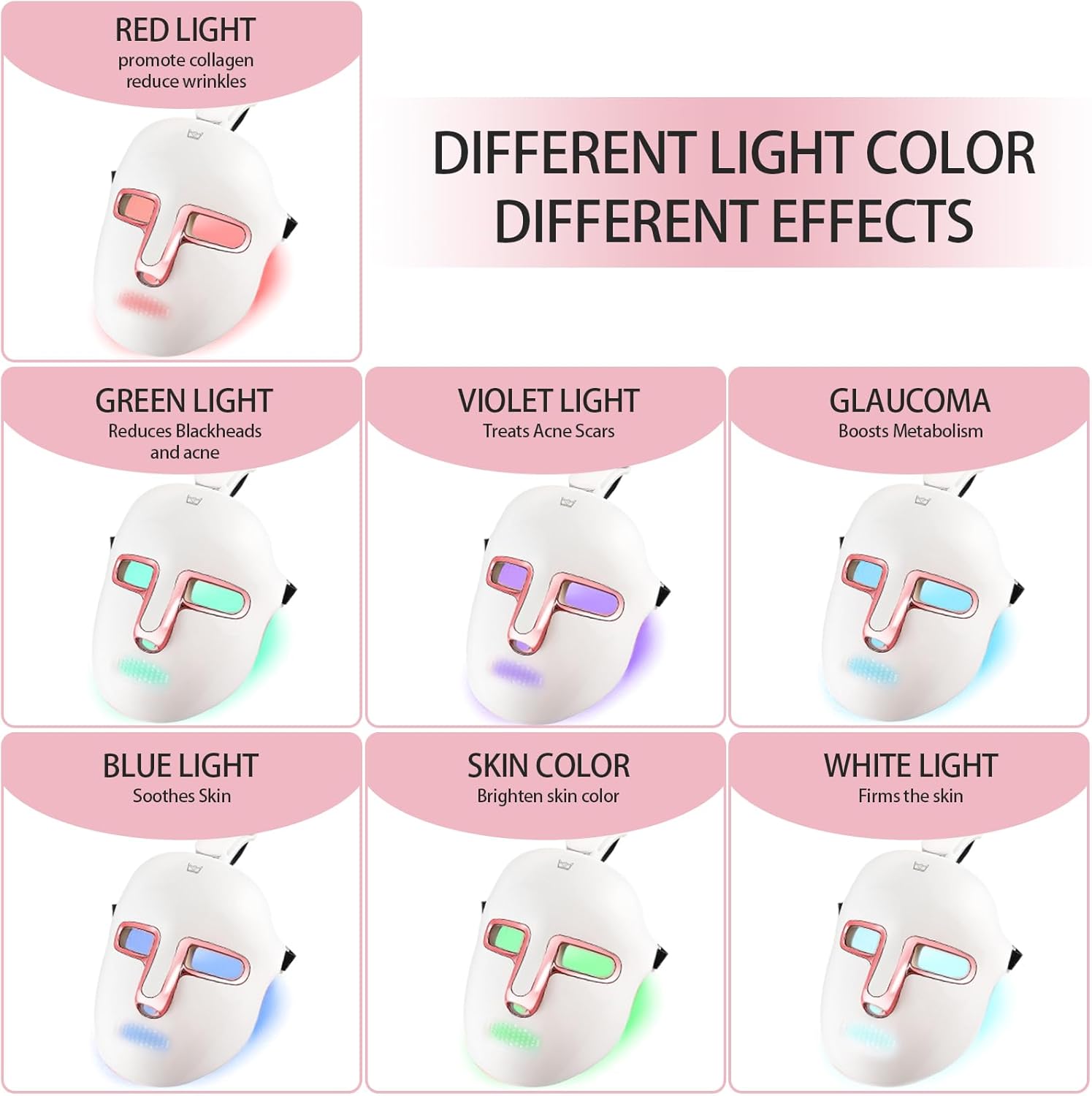 【7 lichte kleurentherapiemasker】Rood licht: bevordert collageen, vermindert rimpels; Groen licht: vermindert mee-eters en acne; blauw licht: kalmeert de huid; violet licht: vermindert acnelittekens; oranje licht: verheldert de huidskleur; Glaucoom: verhoogt de stofwisseling; wit licht: verstevigt de huid