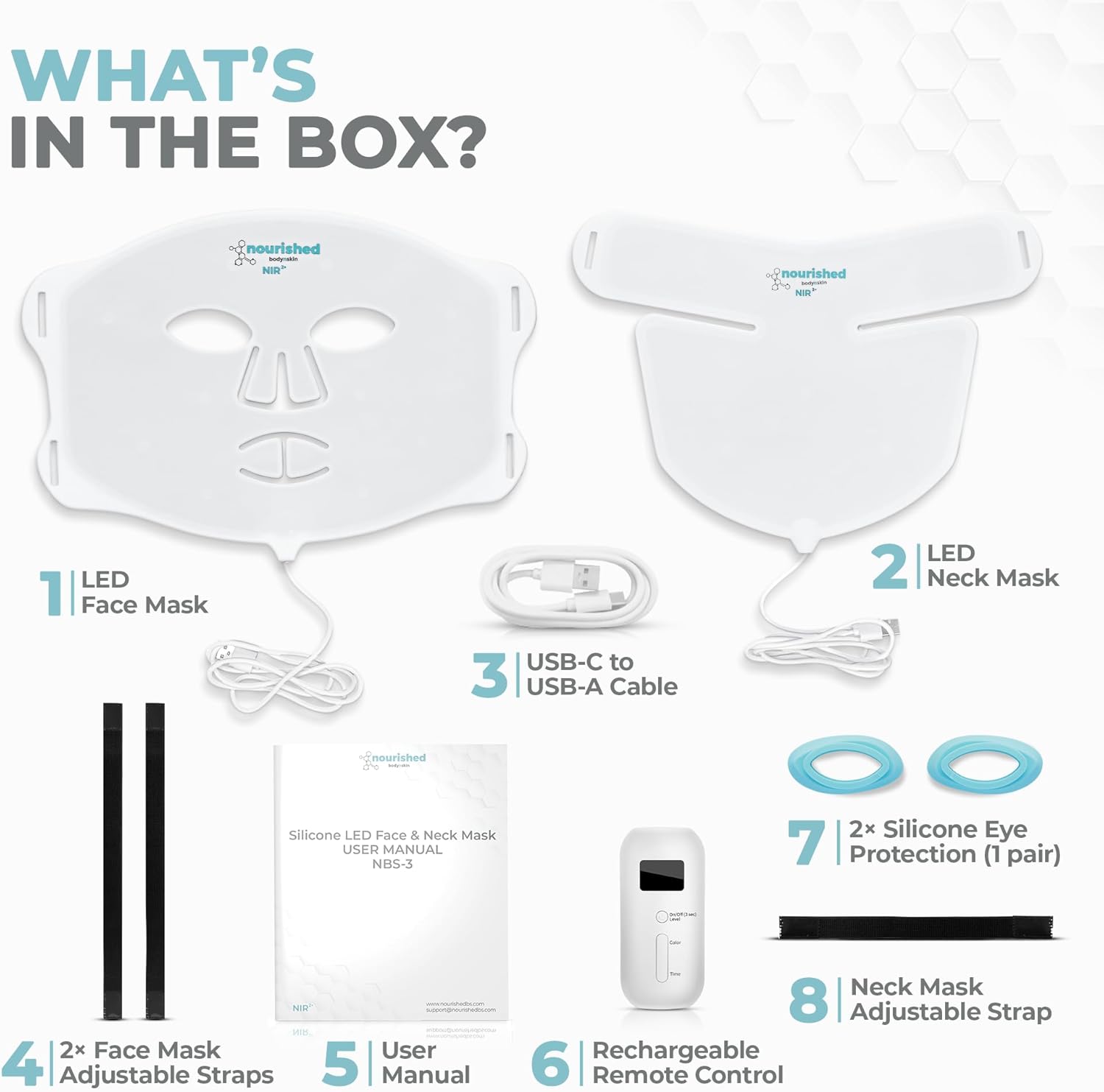 4 ½ stars rounded up to 5. The Nourished Body n Skin masks arrived in a branded box covered in tight plastic. Like the one other red light face mask I ordered a little over a year ago, the box was well designed for all the pieces (everything but a wall block/adapter is included) and it’s a great presentation.The first things I noticed are that this mask is lighter than my old one, the silicone is even softer, there are a few lights above and on the lips (as advertised), and a white drawstring bag is included for easy storage. The face and neck masks may be used together or separately, and each has near-infrared light. These are all improvements over my old mask.The mask arrived mostly charged; it took about 30 minutes to fully charge (the final/fourth bar on the LED display was blinking when I plugged it in and had turned solid).I attached the eye shields (Left and Right are marked; I positioned them so I could read the R and L right above the top of the nose piece), the strap for the neck piece, and the medium straps for the face mask (large straps are also included). The top strap is what holds the face mask in place (right above my ears); I used the bottom strap to pull the mask closer to the bottom of my face. The black straps work, but they look inexpensive, and you’ll need to be careful with how you set them up/position them, otherwise the Velcro will tug your hair. Illustrations for the eye shields and straps would have been helpful. The eyes/nose/lips aligned to my face, but the nose section didn’t provide full coverage, which would have been helpful with the blue light since my nose is a trouble spot.When I turned the controller on (press the On/Off button for 3 seconds) maybe half an hour after being fully charged, only three bars were showing (?). But the controller is well-built, feels good in the hand, and the LED display window (there’s a removable piece of plastic over it which I didn’t notice right away) is very helpful. Like all the masks I’ve seen, the controller is tethered to them.I was immediately happy with this mask’s fit and eye shields, as I could only see a very small amount of light at the bottom, which had been an issue with my old mask.The mask worked as listed and the controller was simple and intuitive to use. 5 power levels are available (click the On/Off/Level button to increase, the default is the lowest level), the Timer’s default is 15 minutes (which may be increased a minute at a time at any time), and clicking Color switched the light from Red to Blue.After my first use (red light on the 2nd power level using both masks) the mask automatically shut down after the 20 minutes I had set it for (there’s also a soft audible beep), and the power indicator was already down to two bars.After my second use (blue light on the 1st power level using only the face mask) the mask’s timer also worked correctly and the power indicator still had two bars.Bottom line? I’m very happy I ordered this mask because the light leakage around the eyes is minimal, the remote is so easy to understand/use, the masks have five power levels and near-infrared light, there are lights above and on the lips, and there’s a neck/décolletage piece. Everything worked and it fit well.The possible places for improvement would be illustrations showing how to attach the eye shields and straps, better nose coverage and maybe battery life, and FDA clearance for the masks (but FDA cleared masks cost more).“Made in China / Designed in Europe”.