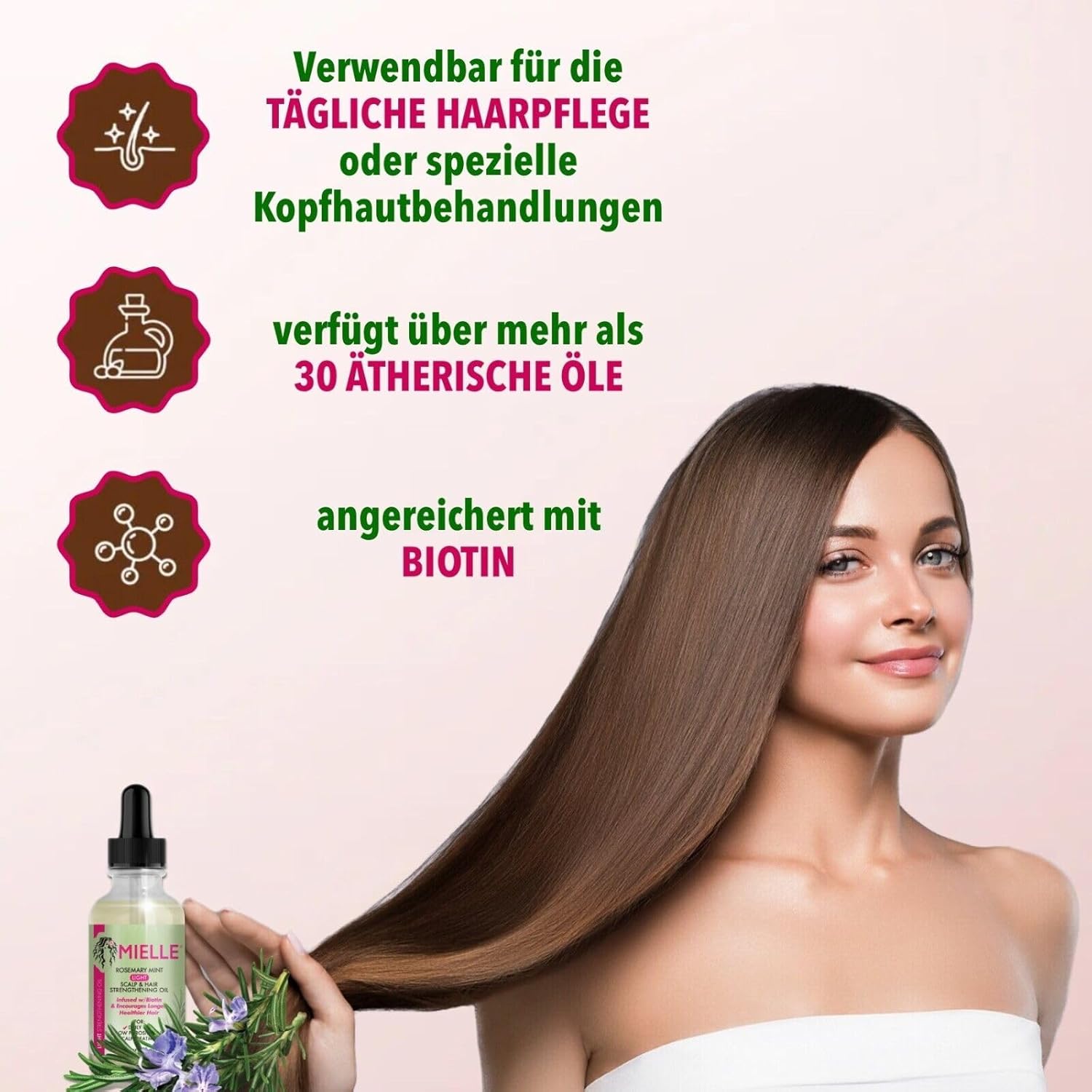 [VERSTERKT DE STRUCTUUR]: P-Beauty rozemarijnolie versterkt de haarstructuur en stimuleert de haargroei. Met meer dan 30 essentiële oliën voorkomt het haaruitval en omhult elke haarlok met vitamines.