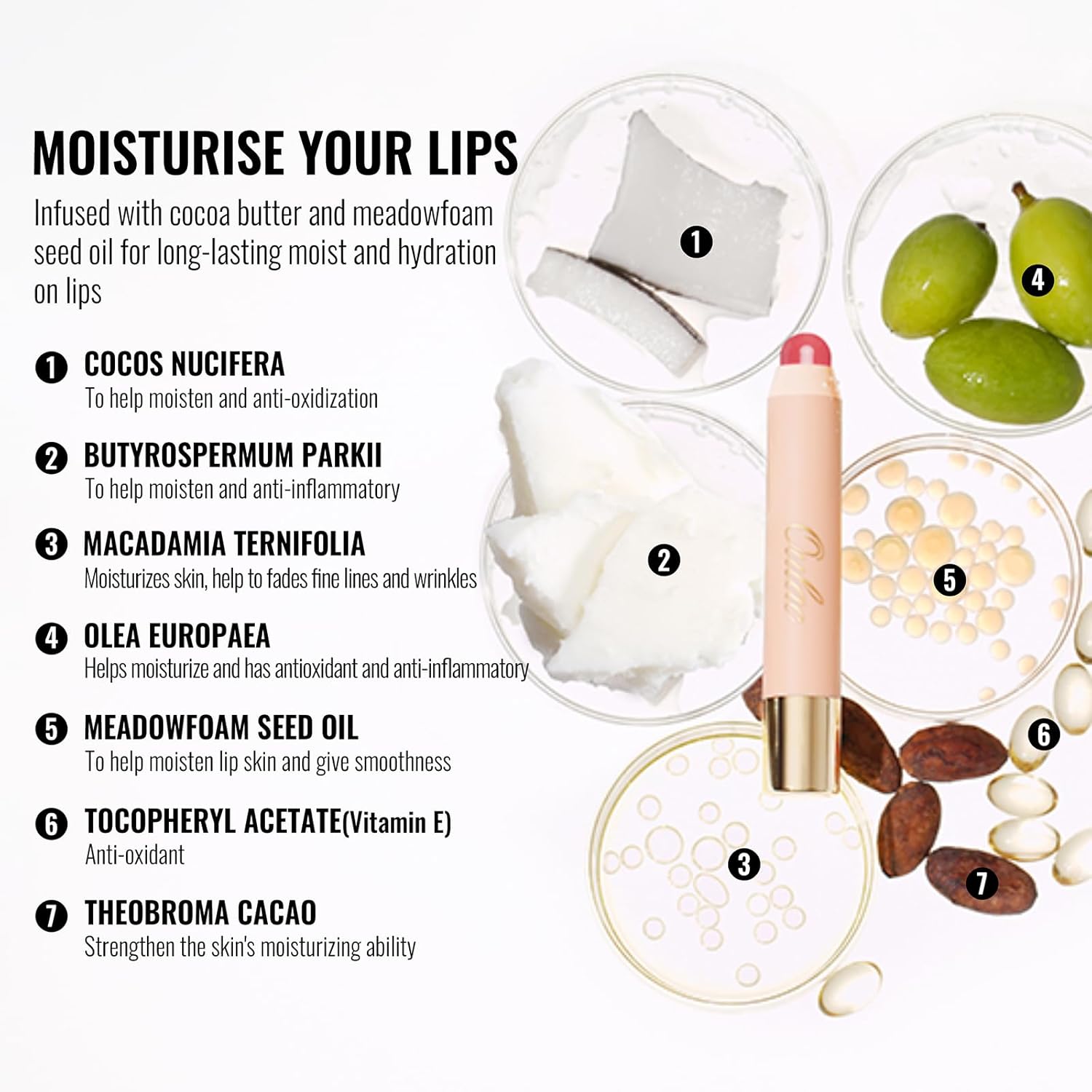 Hydraterend en voedend: Oulac lipkleurpotloden glijden soepel over en smelt op de lippen. Doordrenkt met cacaoboter en weideschuimzaadolie voor vocht en hydratatie.