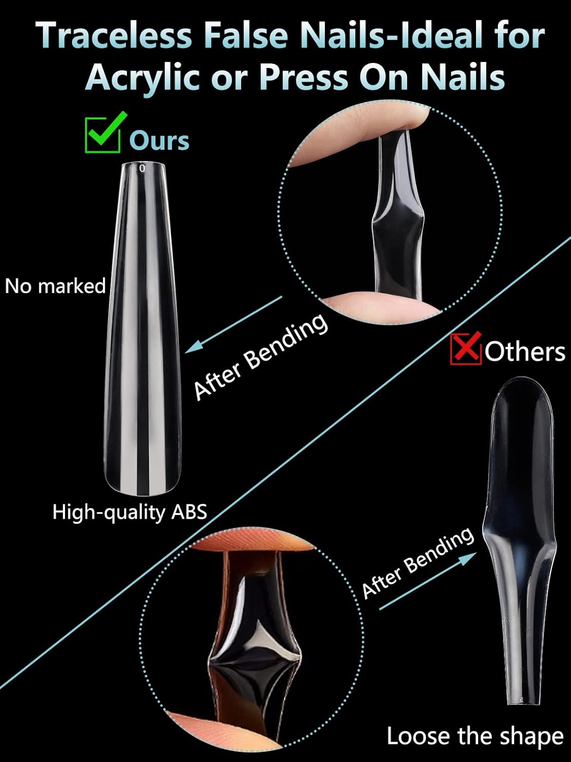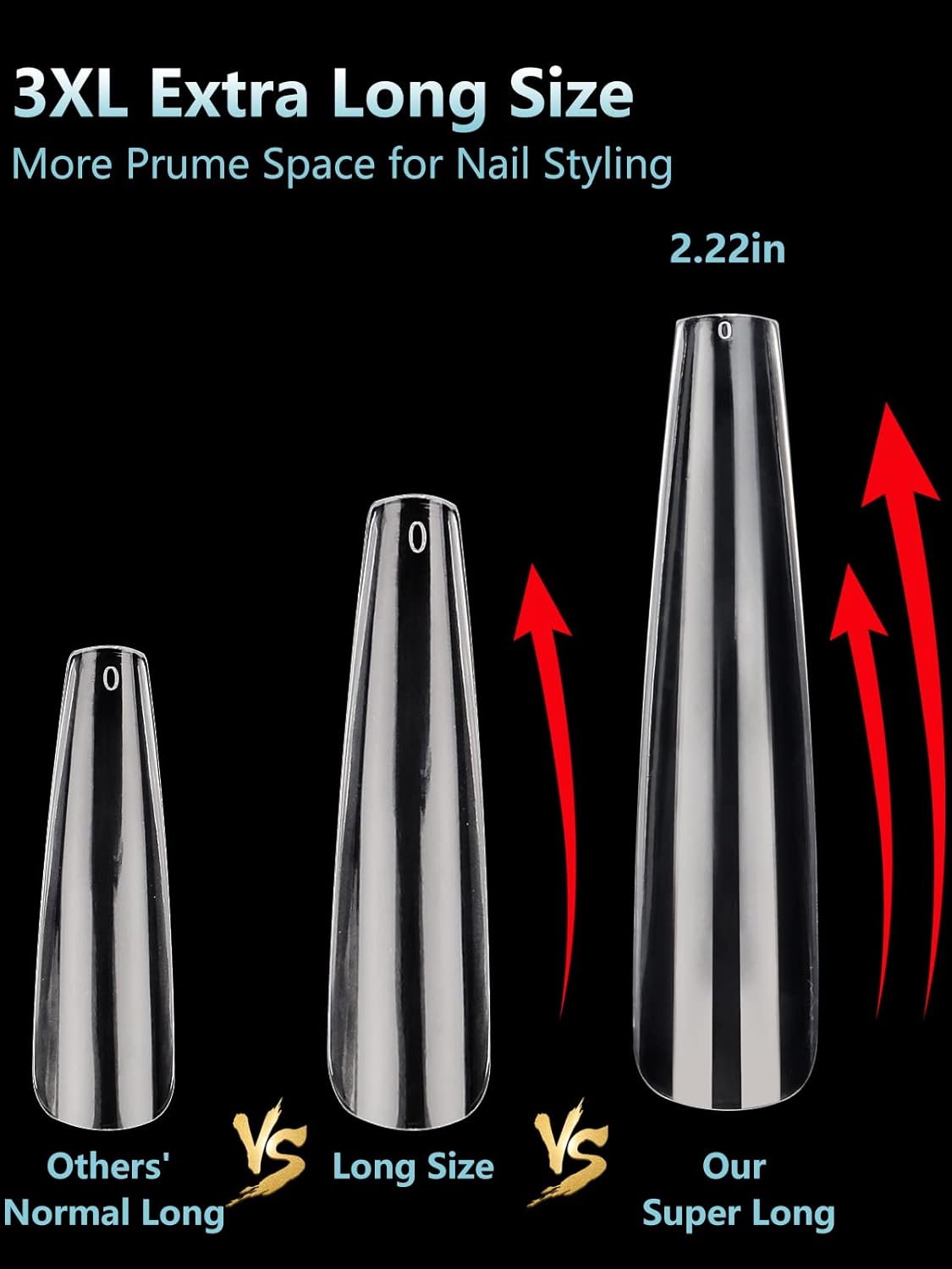 ✨3XL Acrylic Fake Nails: 240Pcs Extra long ballerina nail tips with slightly curve to fit the surface of nails for a comfortable fit, offering 12 different sizes with 20 nails each size. The longest is 2.21” for size 0 and shortest 1.83” for size 11.