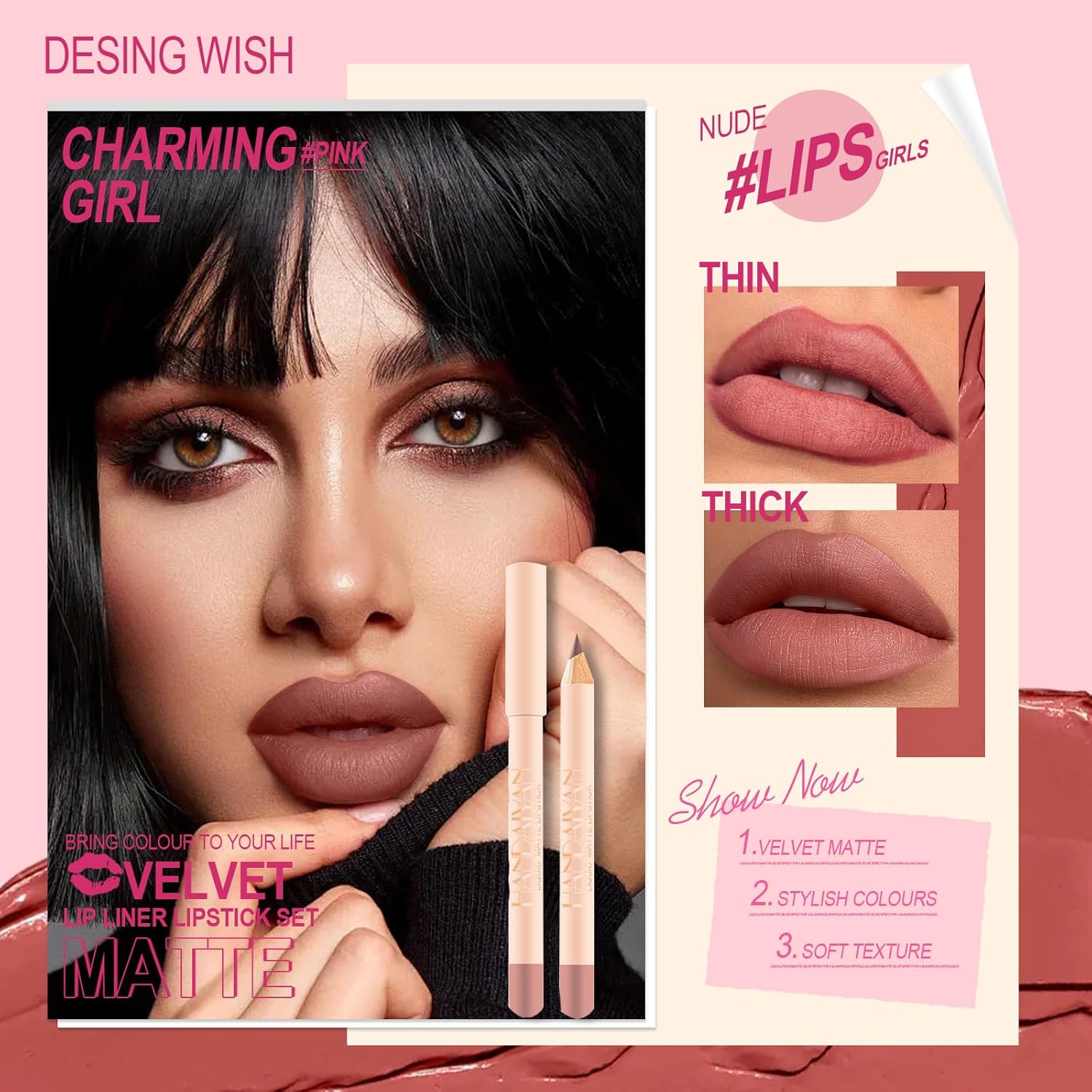 Fluweelmatte textuur, zijdezachte, matte lipliner en vloeibare lipgloss hebben een fluweelachtige textuur, niet-klevend, zijdezacht in gewichtloosheid en geven je een matte, fluweelachtige make-uplook.