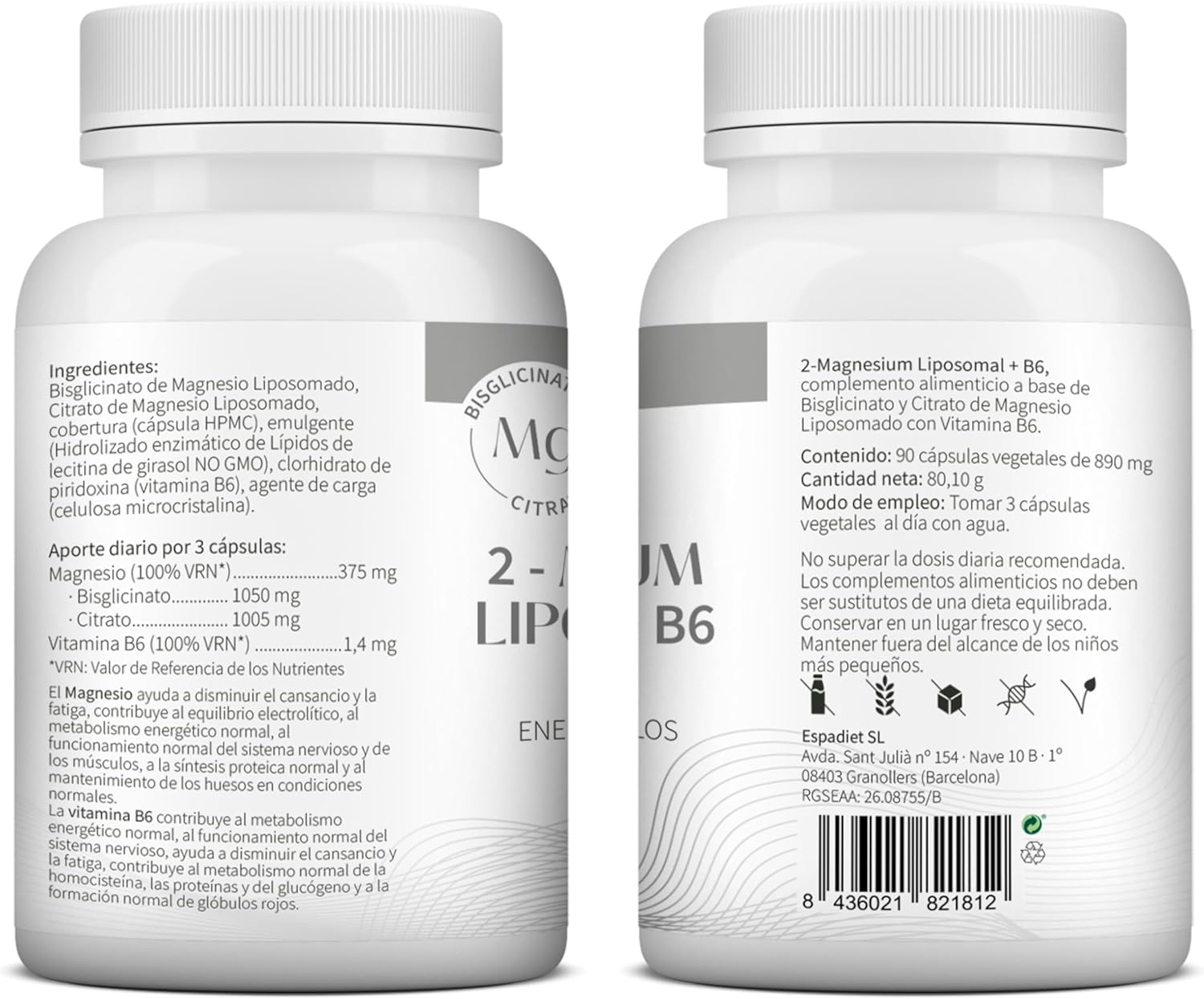Zeer absorberend liposomeerd magnesium. Magnesiumcitraat met magnesiumbisglycinaat bevat geen magnesiumcarbonaat. Magnesium assimileerbaar met vitamine B6