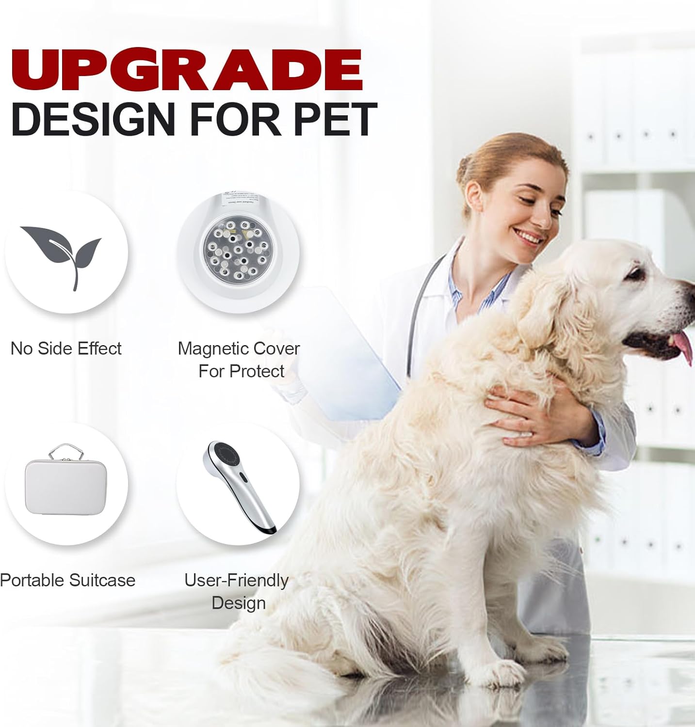 Verbeterd ontwerp: de lage koude laserlichttherapie staat bekend als een volledig natuurlijke en niet-invasieve behandeling, je huisdier zal genieten van de behandeling zonder enig ongemak te voelen. De machine van de lasertherapie is uitgerust met verbeterde ontworpen magnetische dekking die het apparaat tegen direct contact met de huid of wond isoleert voor betere bescherming. Bovendien maakt het mobiele ontwerp ook het schoonmaken gemakkelijker.