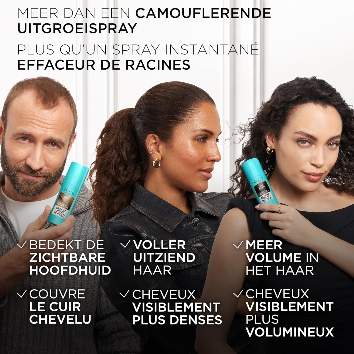 L’Oréal Paris Magic Retouch is een uitwasbare, camouflerende uitgroeispray die jouw uitgroei in 3 seconden laat verdwijnen. De uitgroeispray camoufleert uitgroei tot de eerstvolgende wasbeurt met shampoo. Wanneer je jouw haar kleurt, wordt uitgroei tussen de kleurbeurten door zichtbaar. Magic Retouch uitgroeispray is ontwikkeld om deze uitgroei te camoufleren. Magic Retouch zit in een spuitbus, waardoor je met het handige spraysysteem de formule snel en eenvoudig aanbrengt. De spray mengt zich met de haarkleur van het gekleurde haar, waardoor kleurverschil tot een minimum wordt beperkt en het resultaat natuurlijk oogt. De uitgroeispray dekt uitgroei volledig en is ideaal voor het camoufleren van grijs haar. De formule droogt snel en blijft de hele dag goed zitten. Met behulp van shampoo is de uitgroeispray direct uitwasbaar. Magic Retouch uitgroeispray is beschikbaar in verschillende kleuren. Kies de kleur die zo dicht mogelijk bij de kleur van jouw gekleurde haar ligt voor een zo natuurlijk mogelijk resultaat.