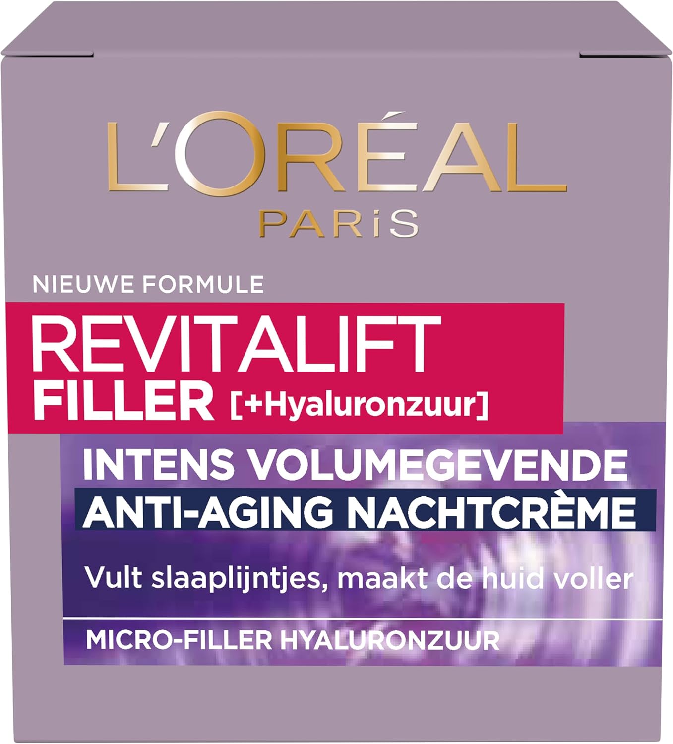 L’Oréal Paris Revitalift Filler Nachtcrème – Anti-Rimpel Gezichtsverzorging – 50 ml Anti-aging nachtcrème verrijkt met micro-hyaluronzuur en fibroxyl voor zichtbaar vollere en stevigere huid. Productbeschrijving Wakker worden met een stralend en glad uitziende huid zonder slaaplijntjes? De L’Oréal Paris Revitalift Filler anti-rimpel nachtcrème bevat een formule met een hoge concentratie hyaluronzuur die de huid meer volume geeft. De huid voelt intens gehydrateerd en oogt frisser Verrijkt met micro-hyaluronzuur voor een stevigere huid Vult zichtbaar rimpels en slaaplijntjes en maakt de huid voller Geschikt voor alle huidtypes, voor vrouwen vanaf 35 jaar Deze unieke nachtcrème is verrijkt met galanga, een plantaardig extract, dat helpt slaaplijntjes zichtbaar te verminderen. Daarnaast bevat de exclusieve formule een hoge concentratie micro-hyaluronzuur, dat de huid geleidelijk meer volume geeft Het resultaat Na applicatie van de Revitalift Filler Nachtcrème zal de huid direct gehydrateerd aanvoelen en zichtbaar frisser lijken. Over een periode van 4 weken zullen rimpels zichtbaar zijn verminderd (voorhoofd -16%, kraaienpootjes -11%, neus-lipplooien -8%*), is de huid voller, zijn wangen verstevigd en zal het volume in het gezicht zichtbaar zijn verbeterd. * Klinische test met 58 vrouwen.