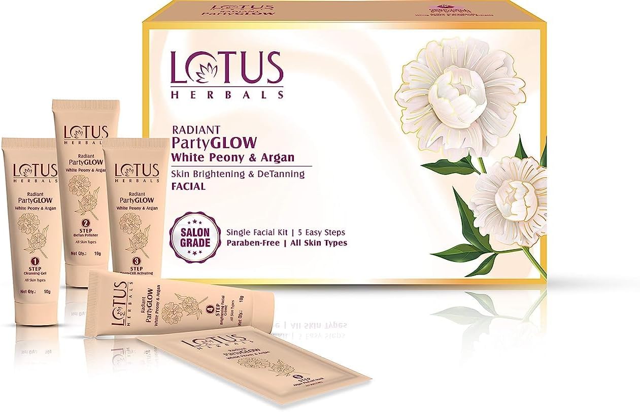 Lotus Herbals Radiant Party Glow White Peony & Argan Oil Skin Brightening, Detanning Facial Kit, 5 eenvoudige stappen, parabenen vrij, Salon Grade, Alle Huidtypen 50 g (Eenmalig gebruik)