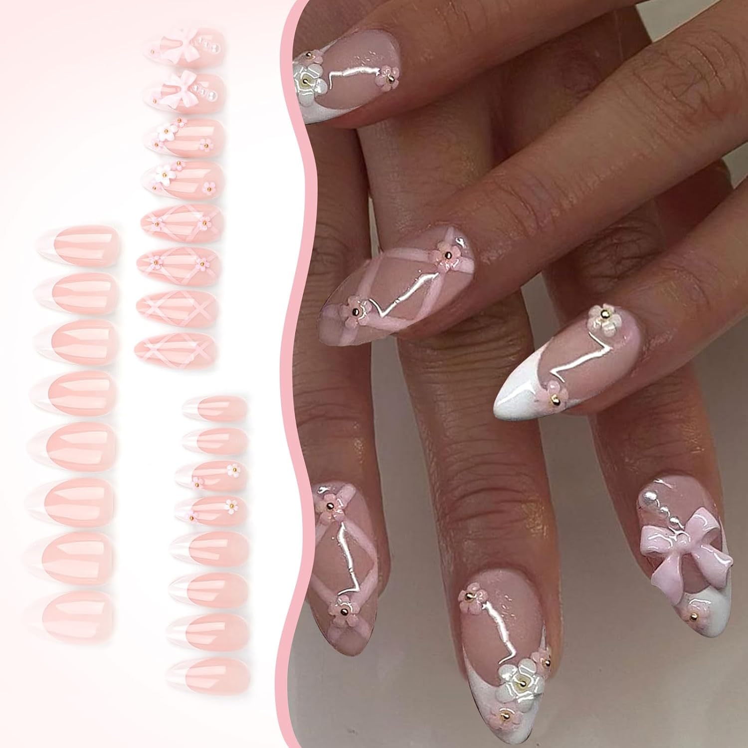 LunarCharm 24 Pieces French Press on Nails Medium Rhinestone Pink False Nails Almond Bling Shiny 3D Flower Artificial Nail Tips Finger Manicure for Women