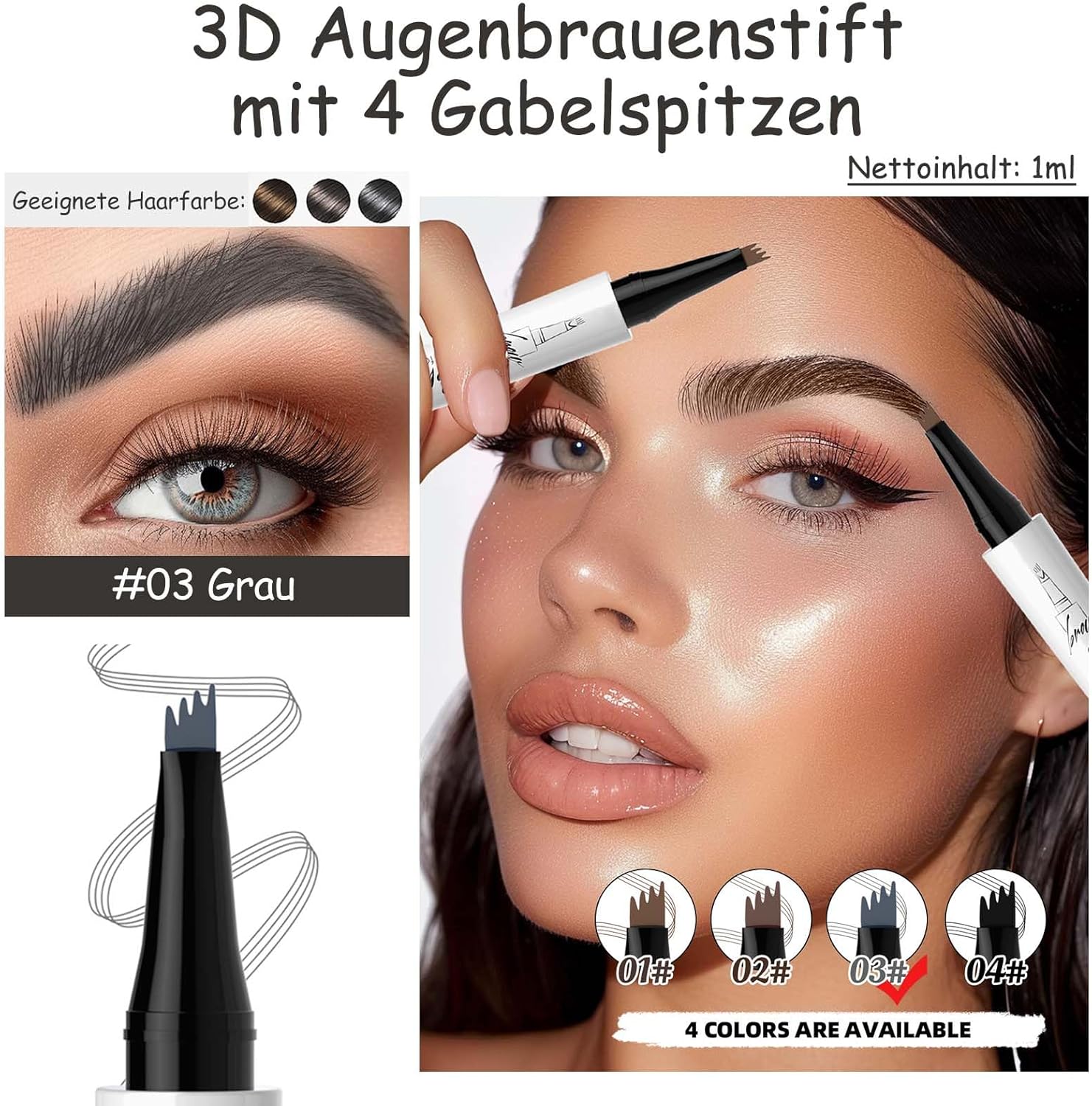 Eyebrow pen with 4 fork tips – the four-tip eyebrow pencil draws 4 fine lines light, smooth and comfortable, filling out hairline spots with just a few lines to create vibrant, natural-looking eyebrows.