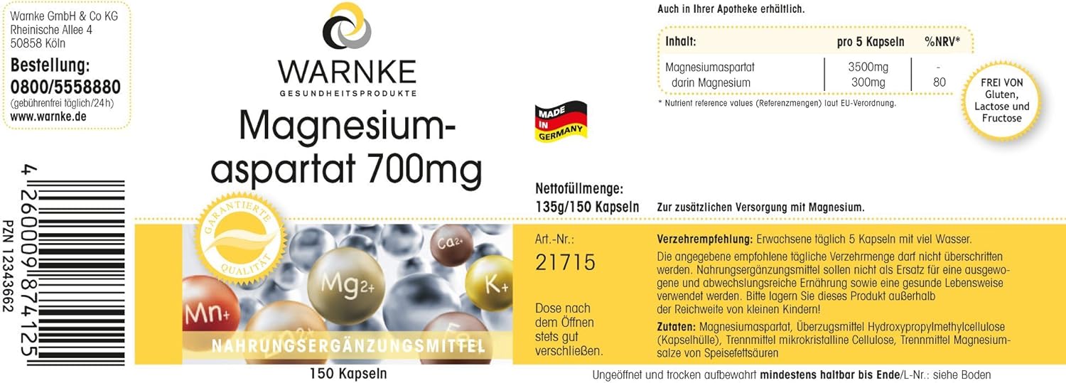 Magnesium-Aspartaat 700mg – hoge dosering & veganistisch – 300mg magnesium per dagdosis – 150 capsules | Warnke Vitalstoffe – Duitse apothekerskwalitei