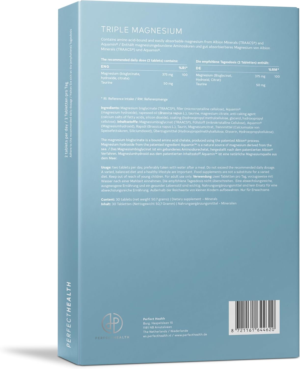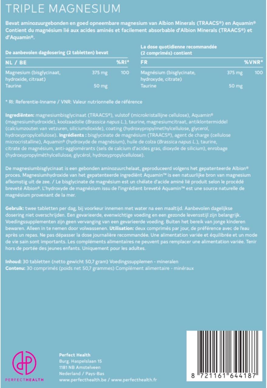 Das “Perfect Health – Triple Magnesium” wird als Pappschuber geliefert in dem sich zwei Blister mit jeweils 15 recht großen Magnesiumtabletten befinden. Wem die Tabletten zu groß sind kann diese mit ein wenig Mühe zerteilen, in der Mitte sind diese dafür bereits leicht eingestanzt.Beworben wird das Triple Magnesium mit seiner hohen Bioverträglichkeit (so dass das Magnesium auch wirkt) und seine hohe Dosis. Im Test wirken die Tabletten exakt so wie ich es von regulären Magnesiumsupplements gewohnt bin (beugt Krämpfen vor, hilft nach dem Sport), weitere Vorteile konnte ich jedoch nicht feststellen. Die hohe Dosis kommt durch die großen Tabletten und der Verzehrempfehlung (2 Tabletten pro Tag) zustande. Dieses wirklich als Pluspunkt herauszustellen halte ich für fragwürdig. Wer wirklich zwei Tabletten pro Tag einnimmt hat dann zwar den Magnesiumsbedarf gedeckt, hat nach 15 Tagen allerdings auch keine Tabletten mehr und muss nachkaufen – bei aktuell knapp 18€ pro Packung ein sehr teures Unterfangen.Zwei Tabletten “Perfect Health – Triple Magnesium” beinhalten 376mg Magnesium und 50mg Taurine (zur besseren Aufnahme des Magnesiums) – Konkurrenzprodukte kommen auf ähnliche Werte, kommen in größeren Packungen daher und kosten – auf die Tagesdosis gerechnet – nur einen Bruchteil von “Perfect Health” – wirken aber (in meinem Fall) exakt genauso.Die Verpackung von “Perfect Health – Triple Magnesium” ist zudem ausschließlich auf Niederländisch. Englische oder gar deutsche Informationen fehlen vollständig.Alles in allem: Wirkt zwar, ich kann aber nur empfehlen für einen Bruchteil der Kosten ein anderes Magnesiumpräparat zu kaufen.