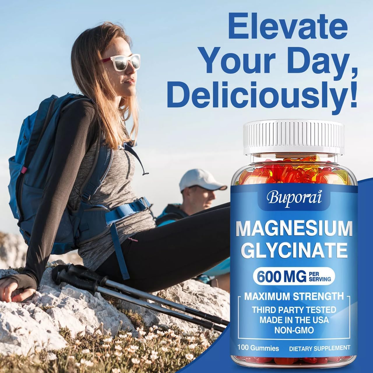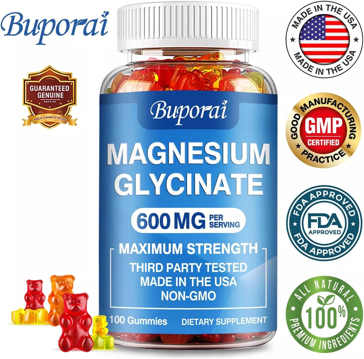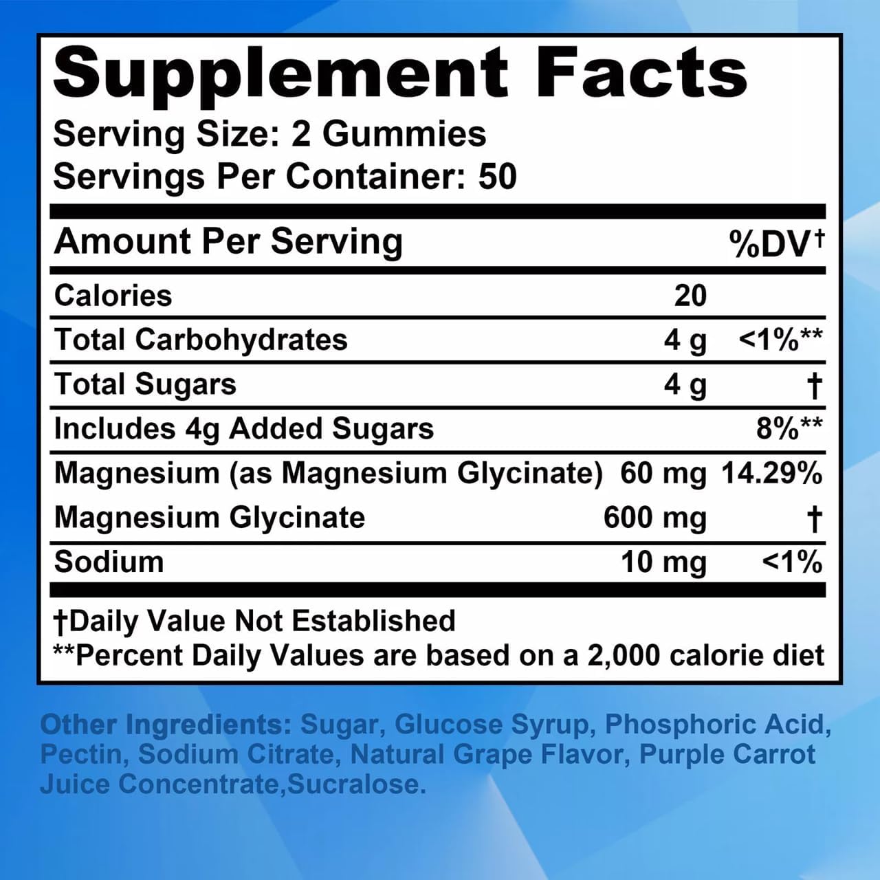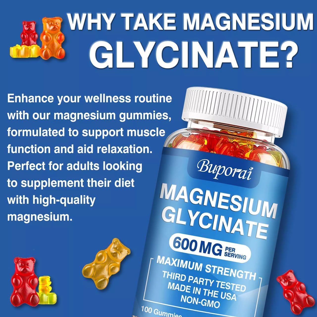 Magnesium Glycinaat 600mg (100 Gummies) Spiergezondheid, Slaapondersteuning Verlichting Stress & Angst