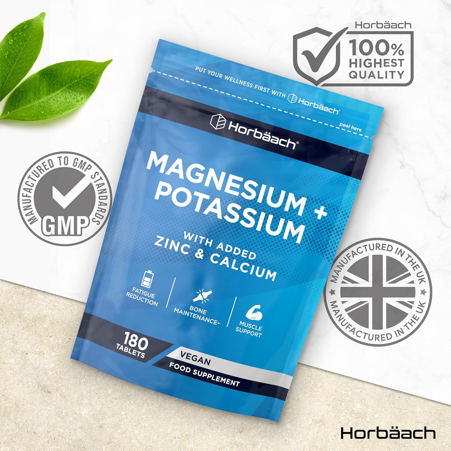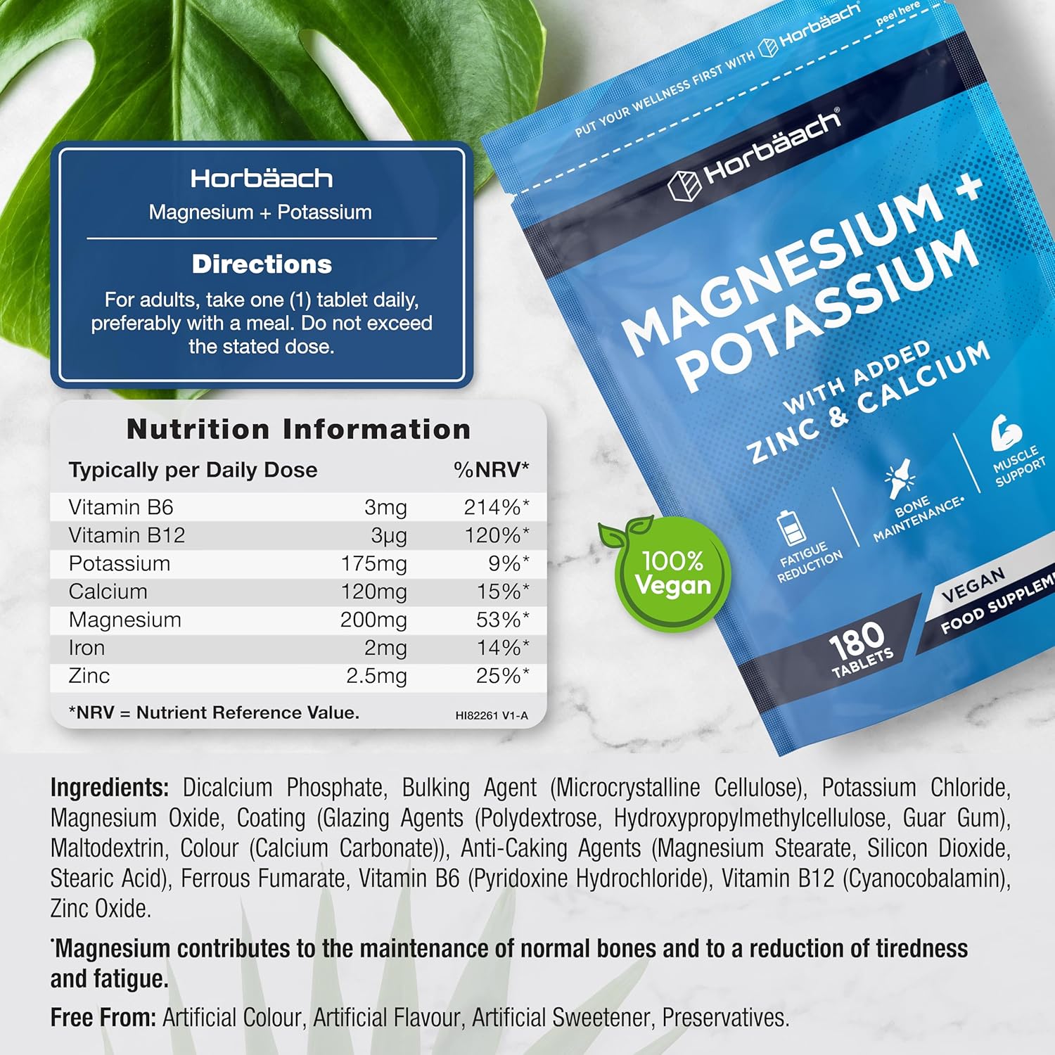 Magnesium Potassium Supplement | 6 Maanden Voorraat – 180 Vegan Tabletten | met Vitamin B6 B12 Calcium Iron & Zink | Hoog Gedoseerd | Horbaach