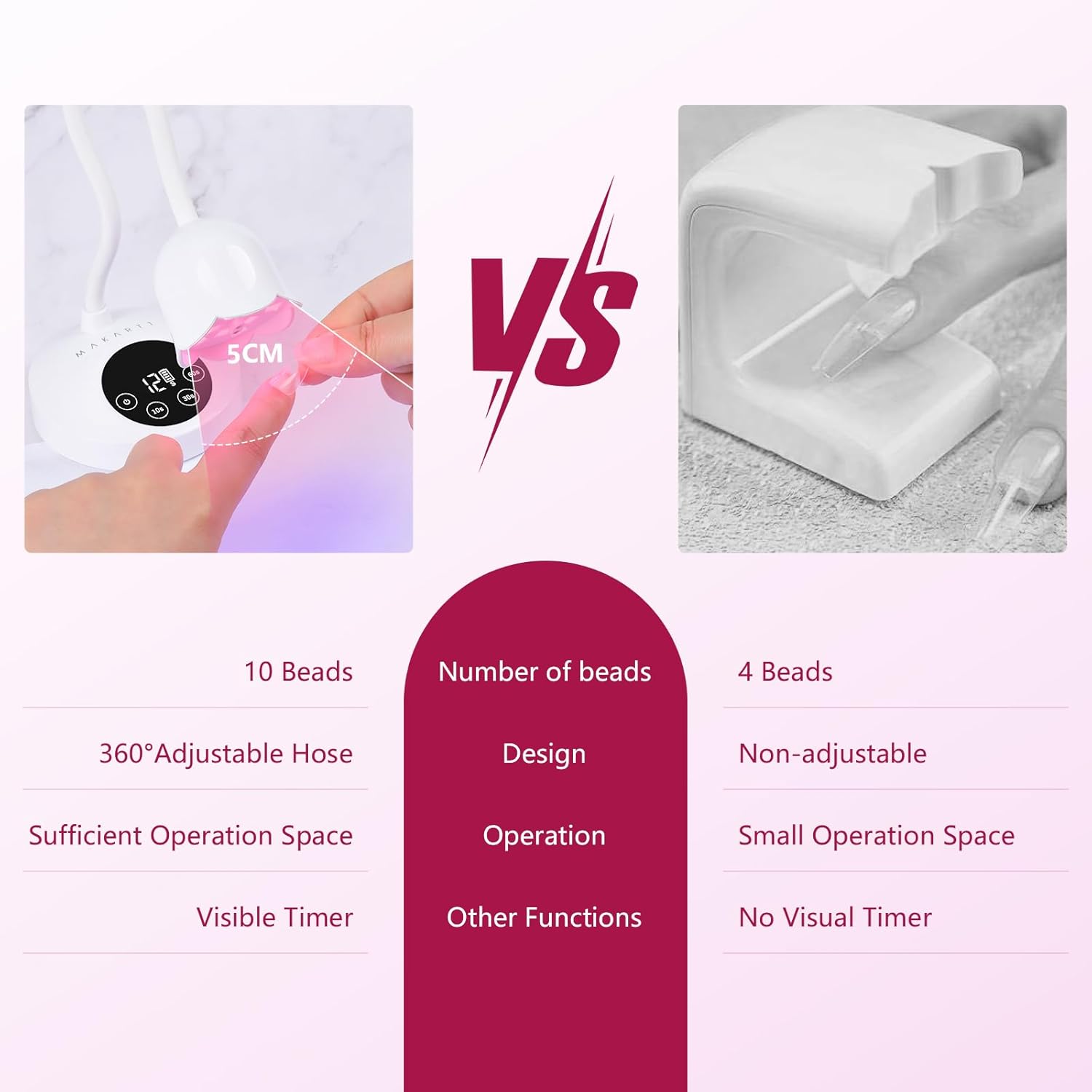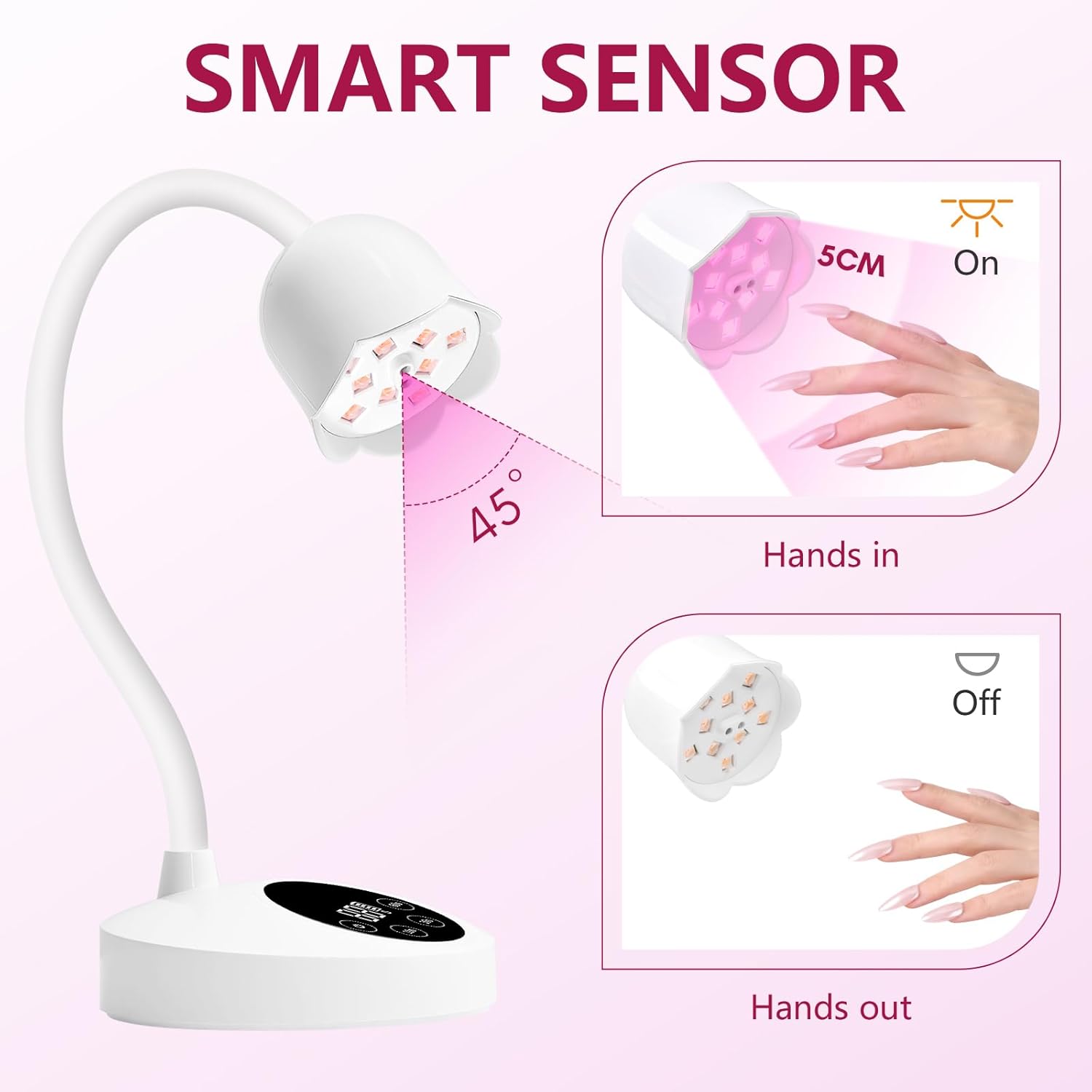 360° verstelbare slang: Ontworpen met een lange ganzenhals, kan deze UV-lamp voor nagels willekeurig worden gebogen en gedraaid, zodat u de ideale verlichtingsrichting en hoek kunt instellen, zodat u het licht precies kunt richten waar u het nodig hebt.