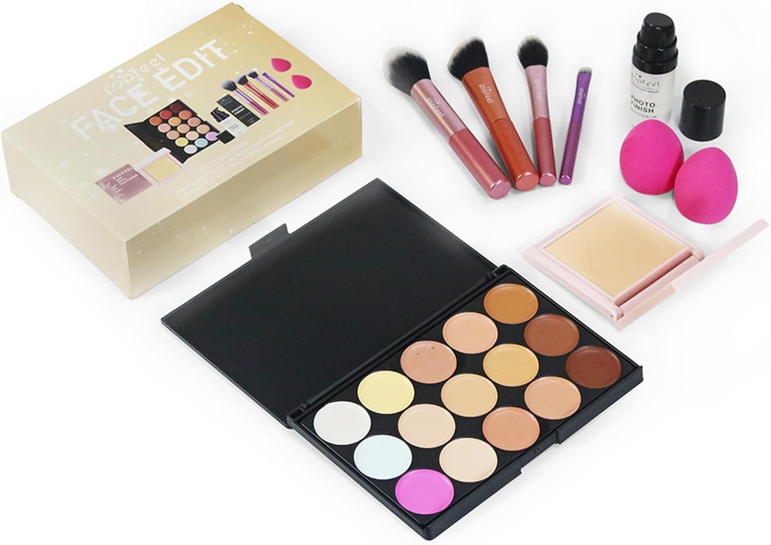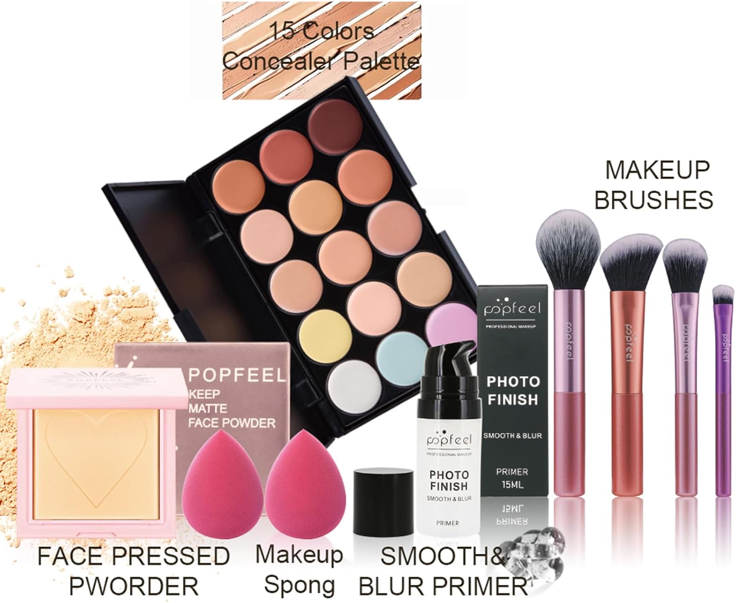 Makeup Kit All In One For Face – De set bevat een primer, poeder en concealerpalet, evenals een set hoogwaardige make-upkwasten en een sponstool. Ontworpen om geleidelijk uw contouren en highlights op te bouwen voor een vlekkeloos, 3D-gezichtseffect. Bouw een driedimensionale make-up op.