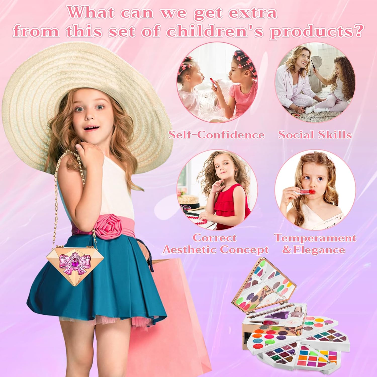 Make-upspeelgoed voor kinderen, 75-delige diamanten make-upset voor meisjes, wasbare speelgoedcosmeticaset, make-upset voor kinderen met verlichting en muziek Geschikt voor 3+ meisjes