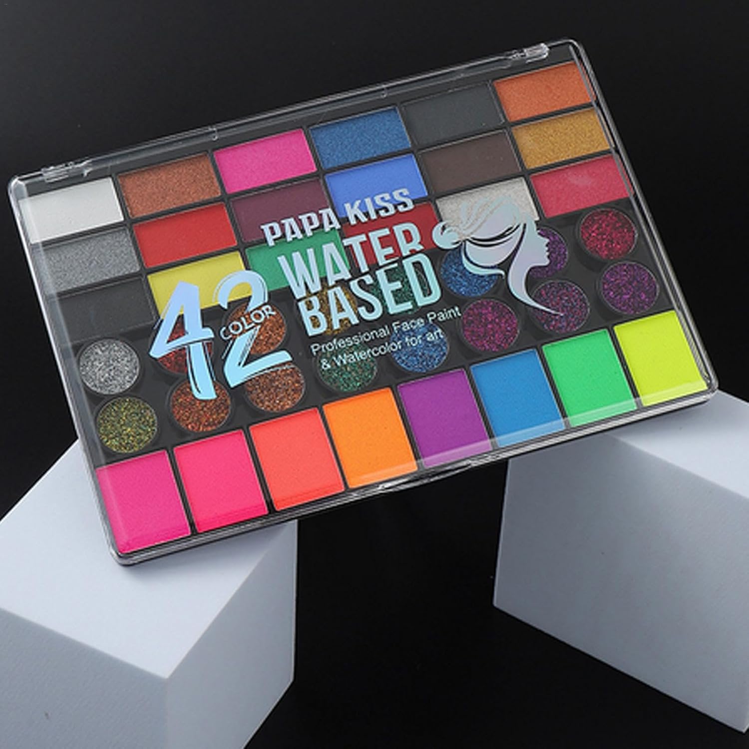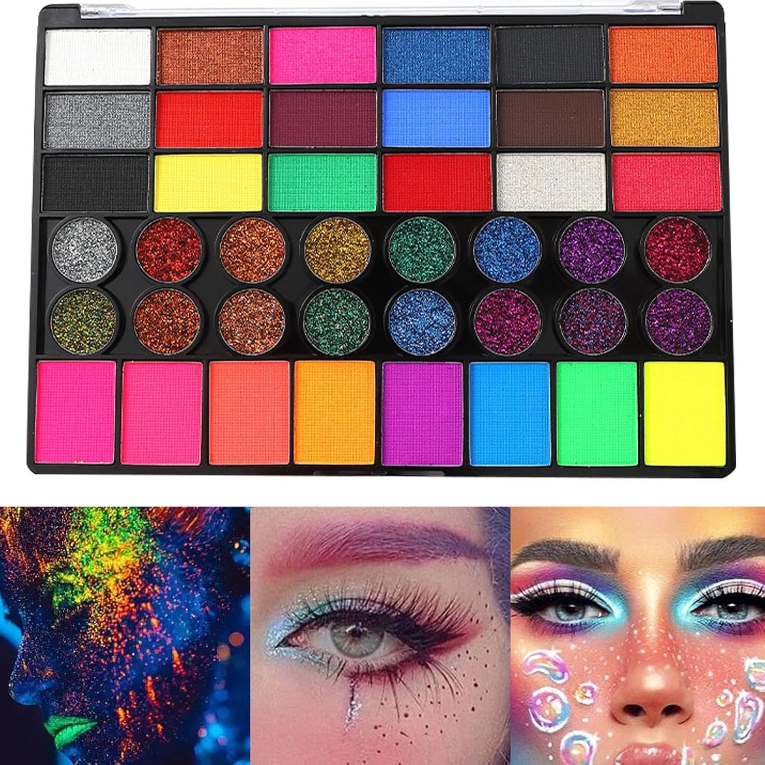 Verbeter je gezichts- en lichaamsschilderspel met ons Face Paint Palette met 18 matte gezichtsverfpigmenten, 42 kleuren, 16 oogverblindende glitterpigmenten en 8 UV-neonpigmenten. Maak adembenemende ontwerpen met onze professionele 74 pigmenten.