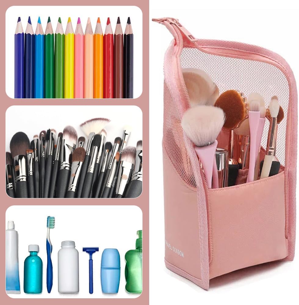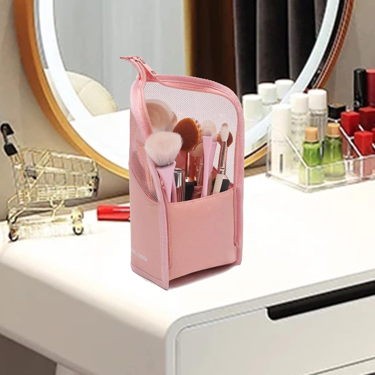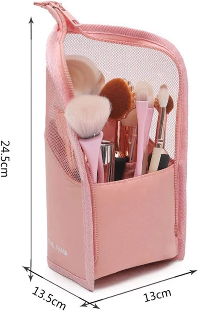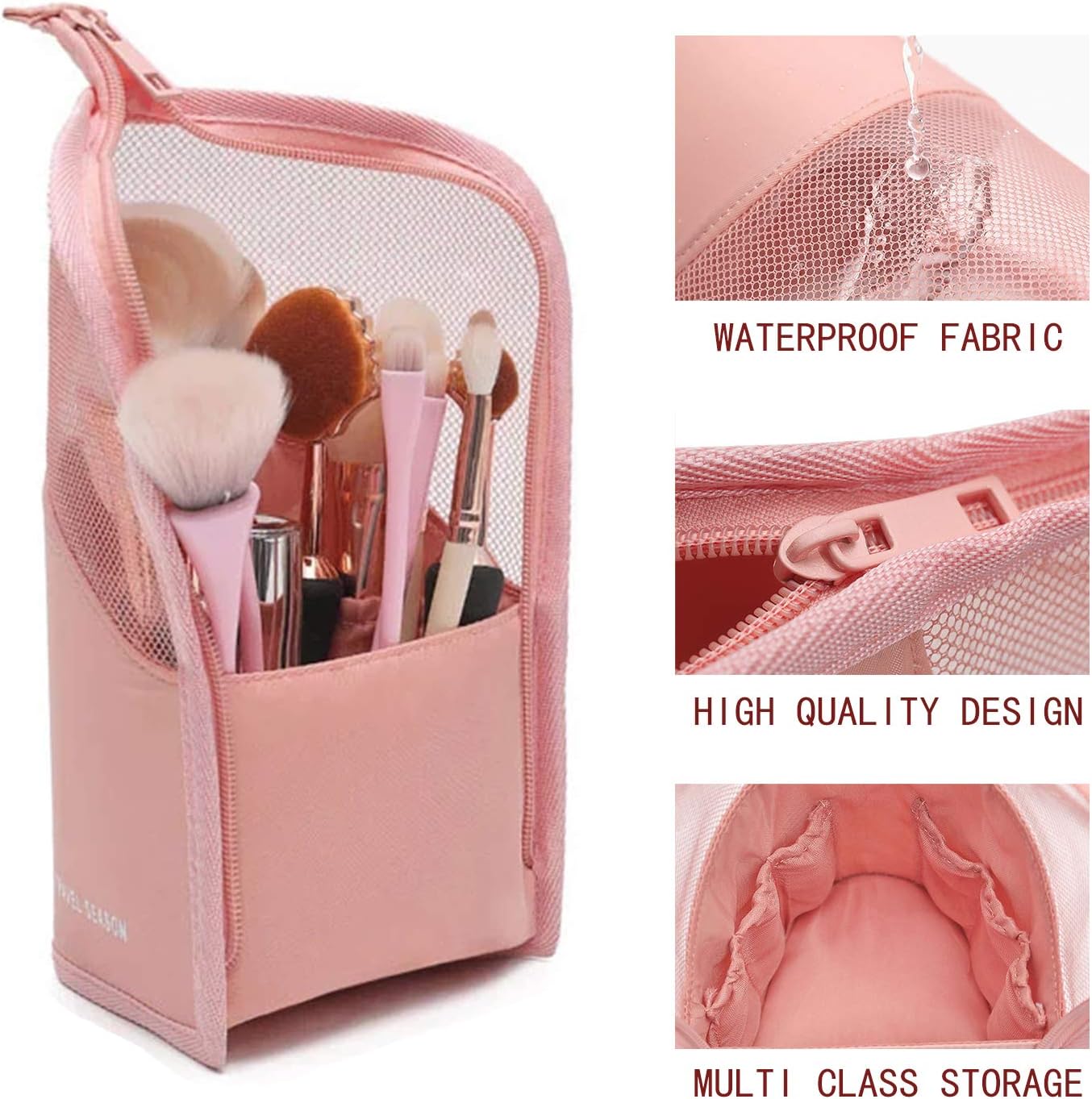 Makeup Brush Bag Multifunctional Makeup Brush Organizer Bag Half Clear Travel Makeup Brush Holder Waterproof Standing Zipper Cosmetic Brush Pouch Polyester Makeup Brush Case Pencil, pink, fashion