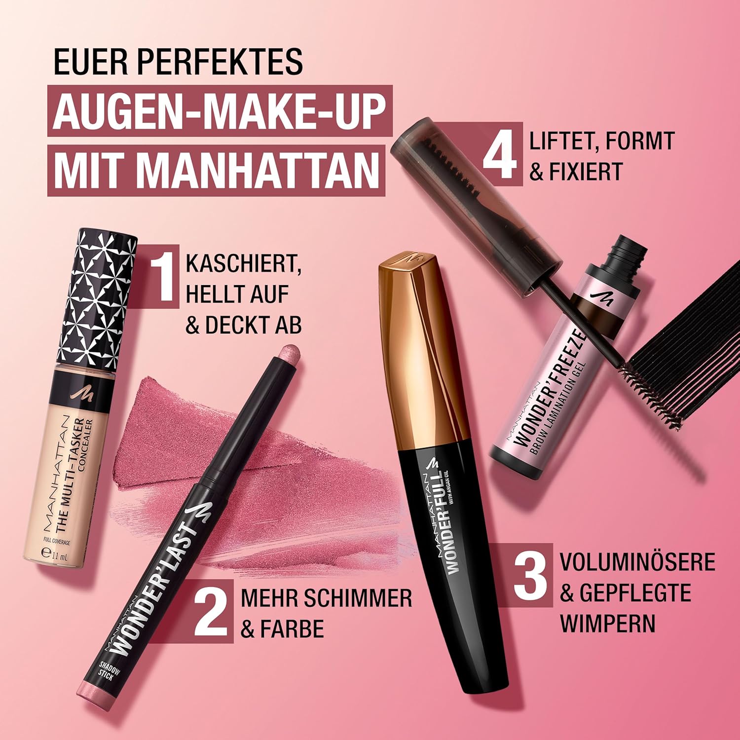 With one step to the perfect eyebrows. The Manhattan Wonder’Freeze Brow laminating gel makes it possible. It lifts your eyebrows, fills them up and shapes and fixes them with one product. Thanks to the double applicator with comb and brush, the eyebrow hairs are neatly separated and perfectly shaped. The vegan, lightweight and clump-free gel formula is water-repellent, sweat-resistant and smudge-proof. The Wonder’Freeze Brow laminate tongue can be applied effortlessly and fixes your styling – for fuller, voluminous and denser eyebrows.