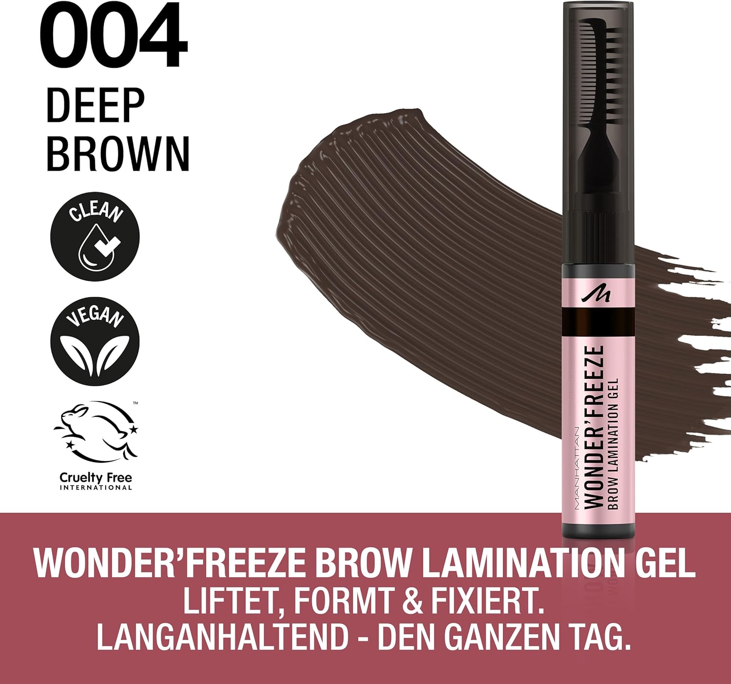 Manhattan Wonder’Freeze Brow Lamination Gel 004 Deep Brown, Water-Repellent and Smudge-Resistant Eyebrow Gel that Shapes and Fixes