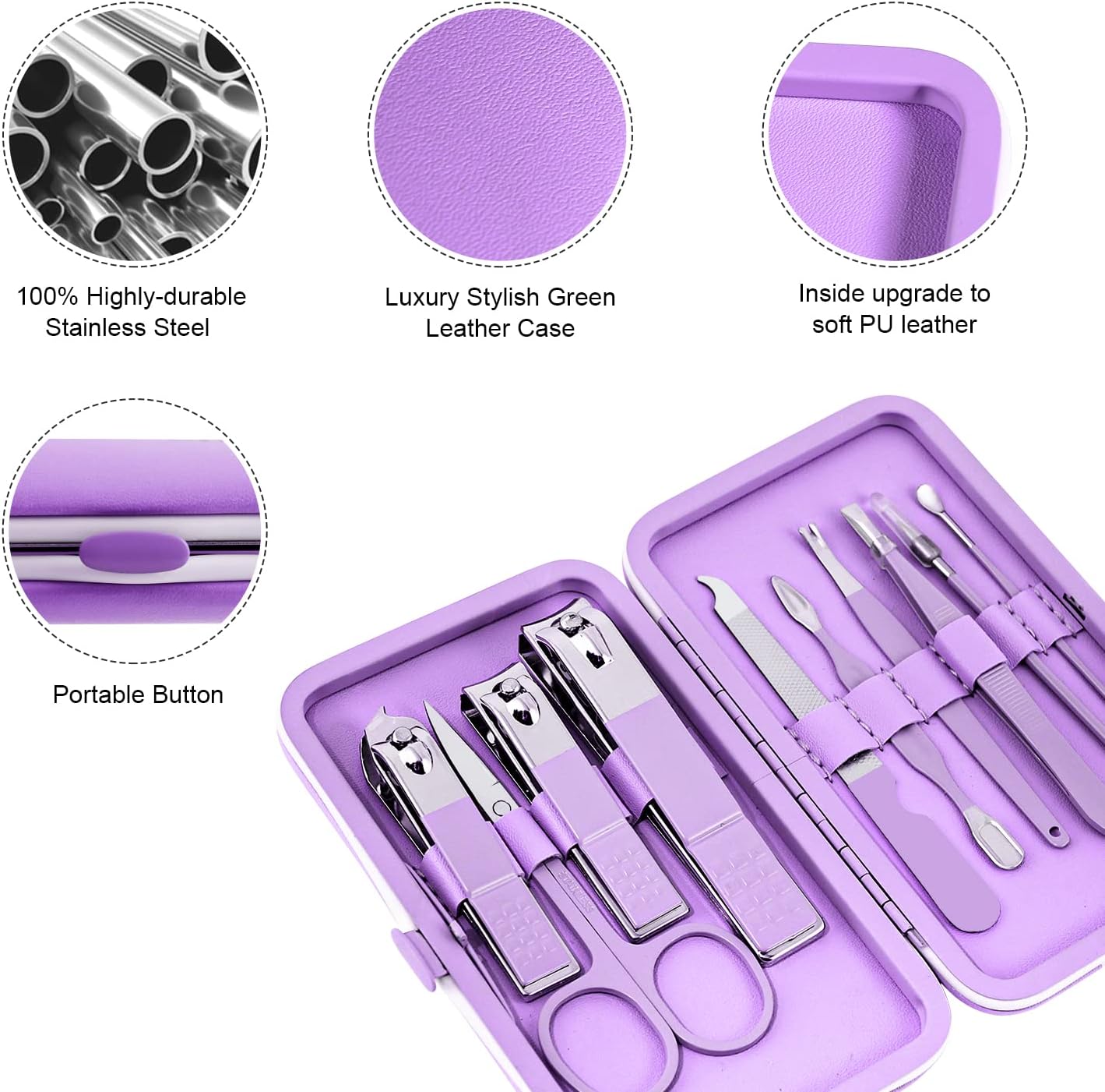Manicure Set 10-delig, pedicureset, nagelschaar, nagelverzorging, nagelknipper, etui, nageletui, nagelknipperset, beauty-kit voor op reis (paars)