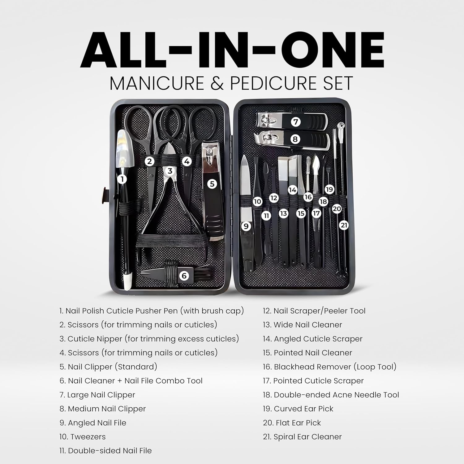 My wife purchased a very similar manicure set for me a few years ago now. There are multiply number of tools which can be used for a number of nail and skin treatments.On my original kit, I had a book of instruction to identify and give usage to all the various tools. This kits hasn’t got any information with it.There is a straight edged blade skin clipper, which is great for clipping those bits of dead bits of skin that rub loose on the tops of the end of the fingers, which currently is my most used tool out of my set.Overall, this kit has a lot more than nail clippers and files, but without the instructions most of the tool will likely never get used.All the tool come in a case. The quality is OK. But I am comparing with my other kit, where as the quality of that one is superb. The tools are a little cluttered in the case, but is ideal for taking in the hold luggage on holidays.At the advertised price there is a lot of kit for the little cost.