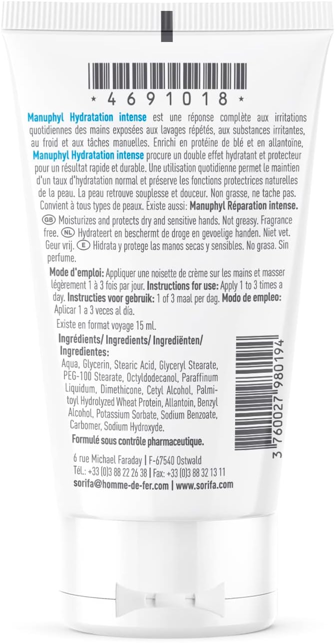 MANUPHYL is a complete answer to the problems of the hands, caused by irritants, repeated washing, housework, cold etc. The original formula – based on regenerating plant bioproteins caused by collagen – provides a triple regenerating, protective and moisturizing effect. Manuphyl is not greasy and absorbs quickly. Perfume free contains no lanolin. 50 ml tube Available in 100 ml and in a soft bag of 800 ml.