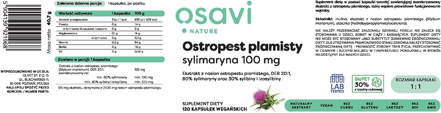 Voedingssupplement in de vorm van een harde capsule met gestandaardiseerd mariadistelextract dat een goede leverfunctie ondersteunt. Wil je zorgen voor je lever, die betrokken is bij de juiste vertering van voedsel, energieopwekking en een belangrijke rol speelt bij de ontgifting van het lichaam? Naast het gebruik van gezonde eetgewoonten, het vermijden van alcohol en regelmatige lichaamsbeweging, overweeg om mariadistel aan te vullen. Deze plant bevat veel waardevolle ingrediënten die de goede werking van de lever en de galwegen positief beïnvloeden. Mariadistel is al sinds de oudheid bekend en behoort tegenwoordig tot de populaire voedingssupplementen. Het extract uit de zaden van de mariadistel is een bron van een flavonolignanencomplex, ook wel silymarine genoemd, dat een van de meest actieve bestanddelen is silybine. Silymarin is een natuurlijke antioxidant en heeft een gunstig effect op het lichaam. Het werkt op het immuunsysteem en is betrokken bij de stimulatie van levercellen om deze te regenereren [1]. Er is vastgesteld dat silymarine in verband wordt gebracht met verminderde insulineresistentie, een daling van de nuchtere insulinespiegels en een daling van de nuchtere glucose, totaal cholesterol, LDL en triglyceriden [2]. Silymarine kan de expressie van genen die betrokken zijn bij de homeostase van galzuren, moduleren die nodig zijn voor de normale vertering van vetten en een gunstig effect hebben op het behoud van normale transaminasespiegels ALT en AST [3,4]. De bepaling van de activiteit van deze enzymen wordt gebruikt bij een zogenaamde leverteproef, de diagnose van leverbeschadiging. Onze lever wordt voortdurend blootgesteld aan ongunstige factoren zoals abnormale levensstijl, gifstoffen, alcoholgebruik en medicijngebruik, dus supplementen moeten worden overwogen om de juiste werking te ondersteunen. Onze mariadistel, silymarine 100 mg is een voedingssupplement met Silybum marianumzaad extract, DER 20:1, gestandaardiseerd voor min. 80% silymarine en 30% silibine en isosylbine. Een dagelijkse portie van 1 capsule levert 125 mg zaadextract, inclusief min. 100 mg silymarine. Deze hoeveelheid extract komt overeen met 2,5 g mariadistelzaad. Geschikt voor veganisten en vegetariërs. De mariadistel ondersteunt een goede leverfunctie, zodat je van je gezondheid en welzijn kunt genieten. Zorg goed voor je lever met mariadistel! Waarom moet je mariadistel, silymarine 100 mg aanvullen?- Mariadistel ondersteunt een goede werking van de lever en de galwegen.- Mariadistel draagt bij aan de regeneratie van de levercellen.- Door de leverfunctie van mariadistel te ondersteunen. est gespikkelde helpt Om gifstoffen uit het lichaam te elimineren. Wat maakt de capsules Mariadistel, 100 mg silymarin?- Bevat mariadistelzaadextract (Silybum marianum), DER 20:1, gestandaardiseerd op min. 80% silymarine en 30% silybine en isosylbine. – Silymarine is een uit mariadistel gewonnen complex van plantaardige verbindingen waarvan het belangrijkste werkzame bestanddeel flavonoïde-silibine is.- Zuiver etiket – Geen onnodige additieven.- Geschikt voor vegetariërs en veganisten. Suikervrij, lactosevrij, sojavrij, GMO-vrij. Verpakking gemaakt van BioPET (30% van het materiaal komt uit suikerriet).