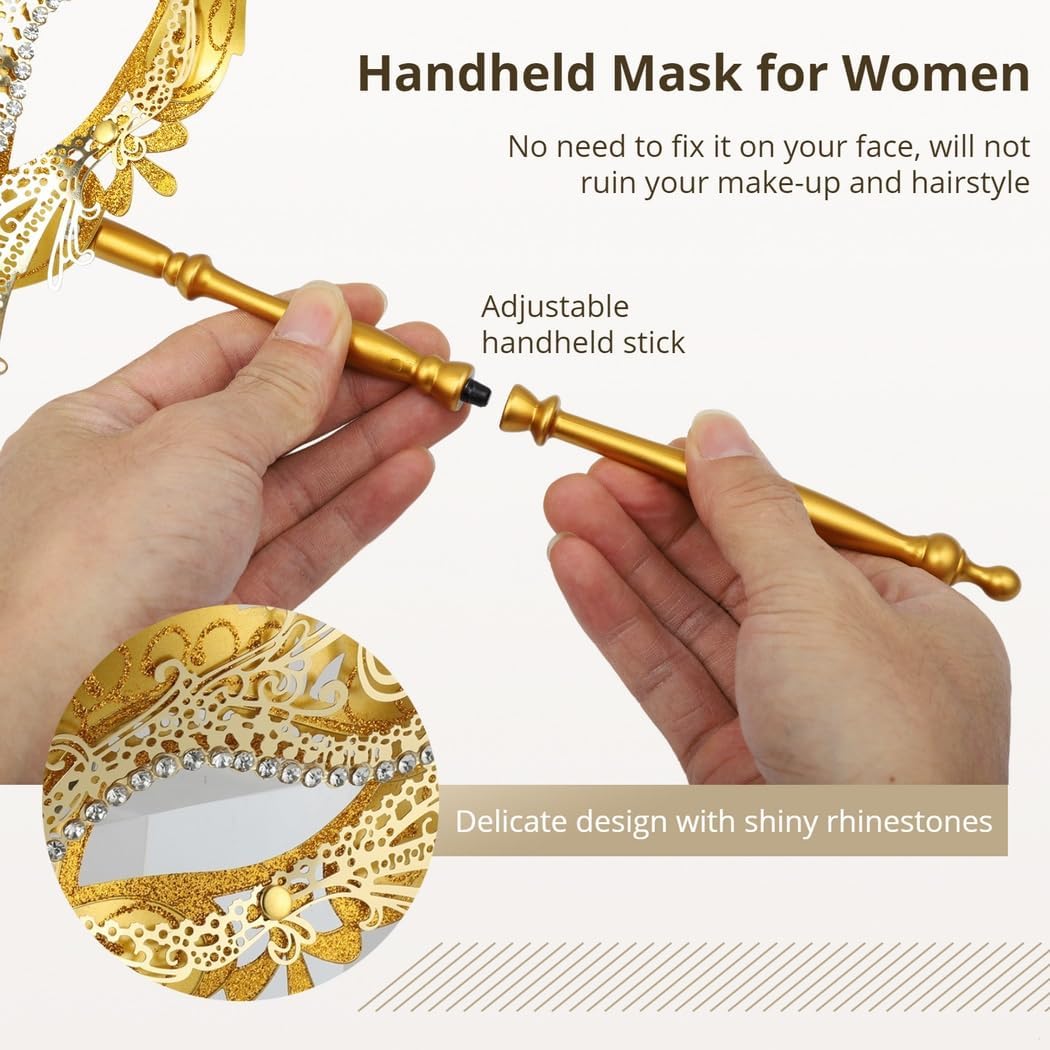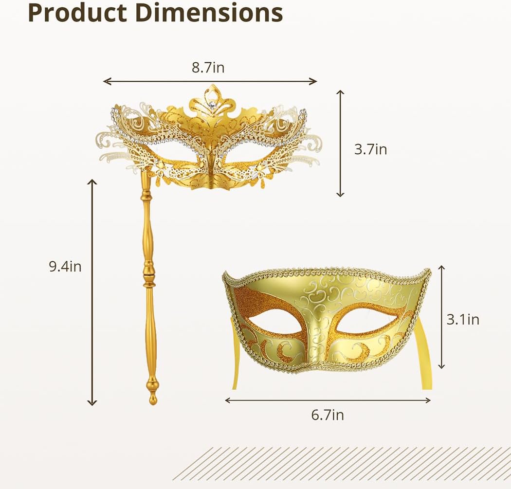 Kleur: goud Materiaal: kunststof, metaal Pakketgrootte: 9.84*4.72*3.94”(L*W*H) Pakket bevat: 2 x masker Opmerking: – Raadpleeg de meting. Kleine meetfouten zijn toegestaan binnen het normale bereik. – Er kan een klein kleurverschil zijn als gevolg van de monitor, camera of andere factoren, raadpleeg het fysieke item.