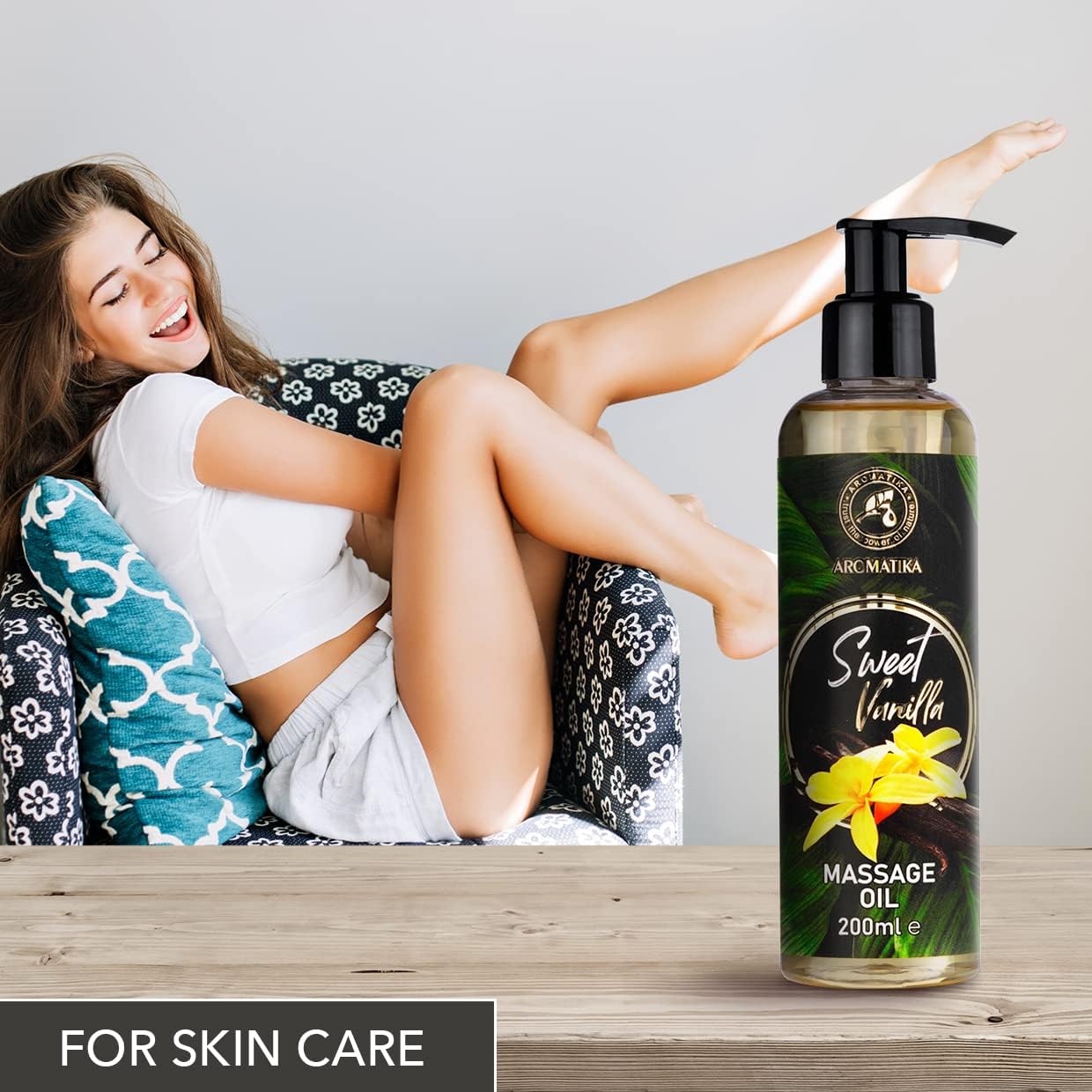 Massageolie vanille, 200 ml, lichaamsolie met amandelolie, druivenpitolie, perzikpitolie, jojoba-olie, massageolie voor alle huidtypes, ontspanningsolie, lichaamsverzorgingsolie, liefdesolie voor partnermassage