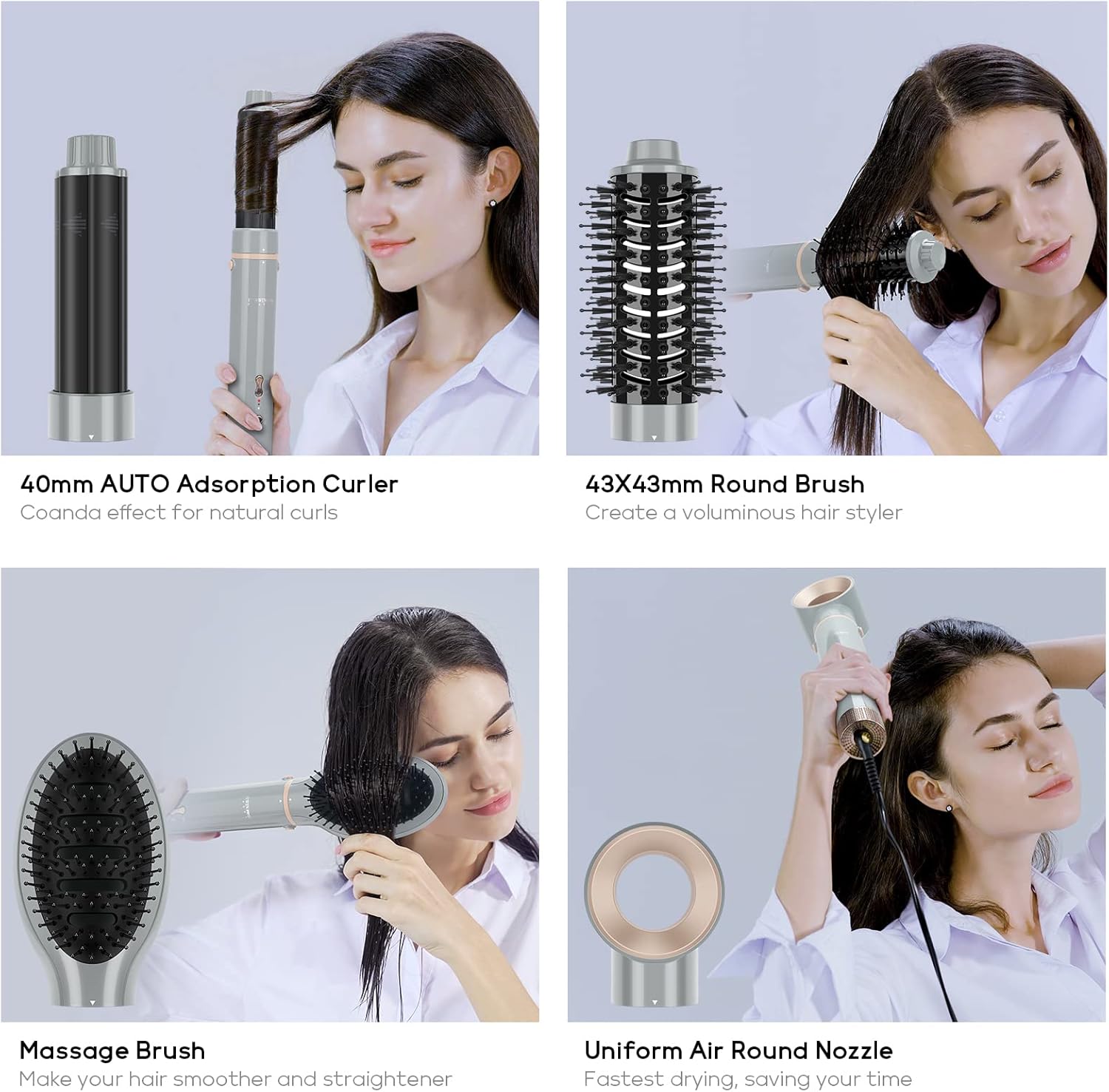 MaxAir Styler, 5-in-1 haardroger, warmluchtborstelset, ronde borstel-föhn, krultang, 5 opzetstukken, drogen, glad, volume, krullen, ionenverzorging, motor met hoge snelheid, grijs