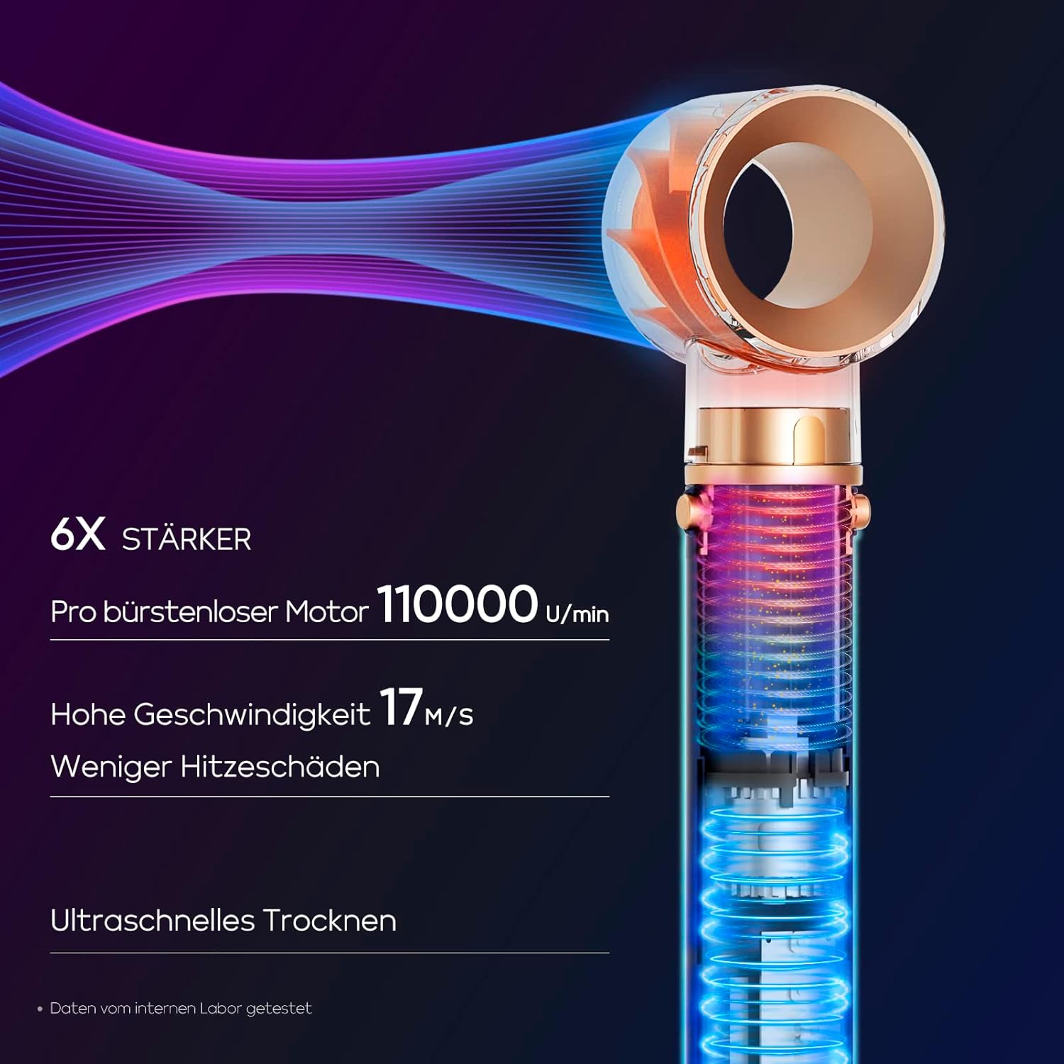 Hogesnelheidsstroom: de zelf ontwikkelde hogesnelheidsmotor met maximaal 110.000 omw/min produceert een snelle en krachtige luchtstroom met een snelheid van maximaal 17 m/s, 6 keer sterker dan een heteluchtborstel. Voor ultrasnel drogen zonder hitteschade, verkort de stylingtijd met de helft. Innovatie voor een buitengewone styling-ervaring.