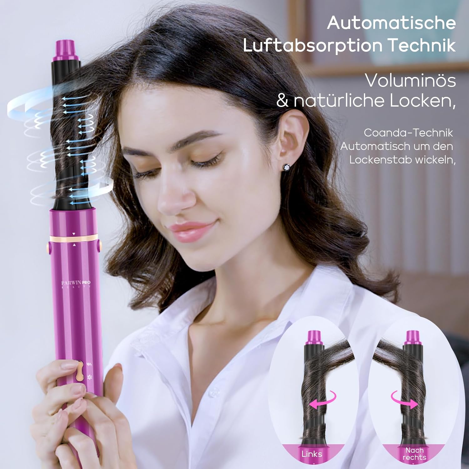 Automatische absorptiestang: een sterke luchtstroom stroomt van de krultang en vormt continu een luchtstroom met de klok mee om de krultang, die het coanda-effect verbetert en ervoor zorgt dat het haar automatisch aan het oppervlak hecht. Creëert volumineuze, gladde en natuurlijke krullen zonder extreme verwarming.