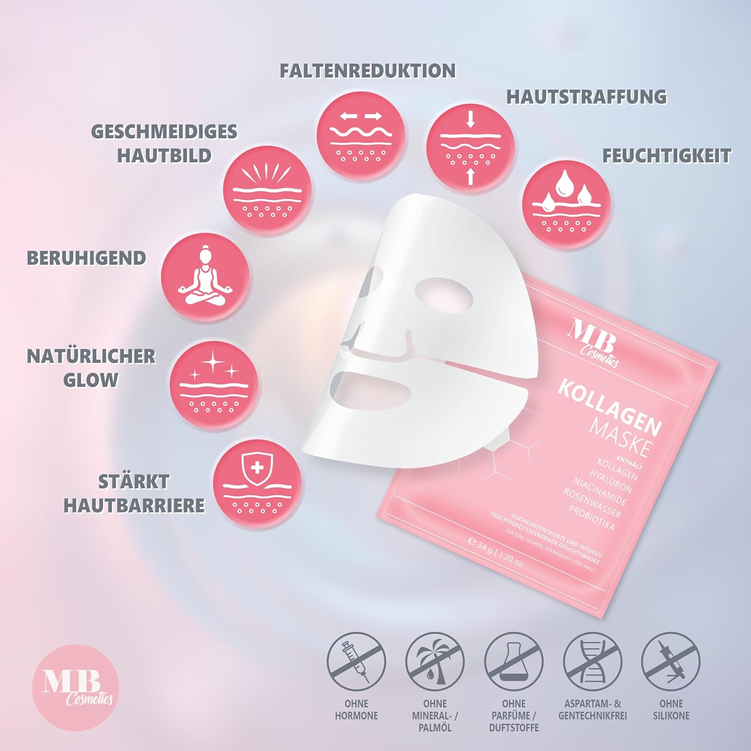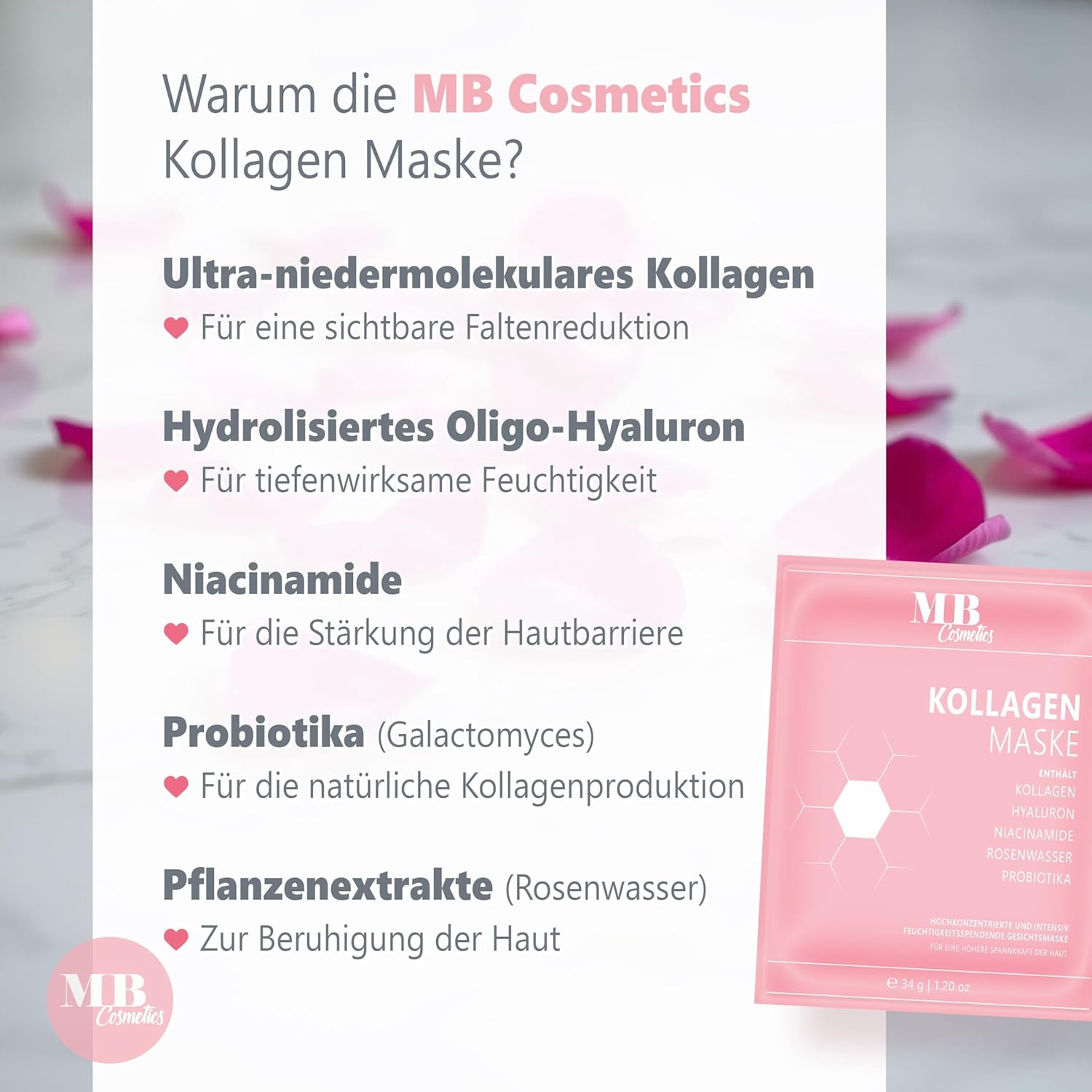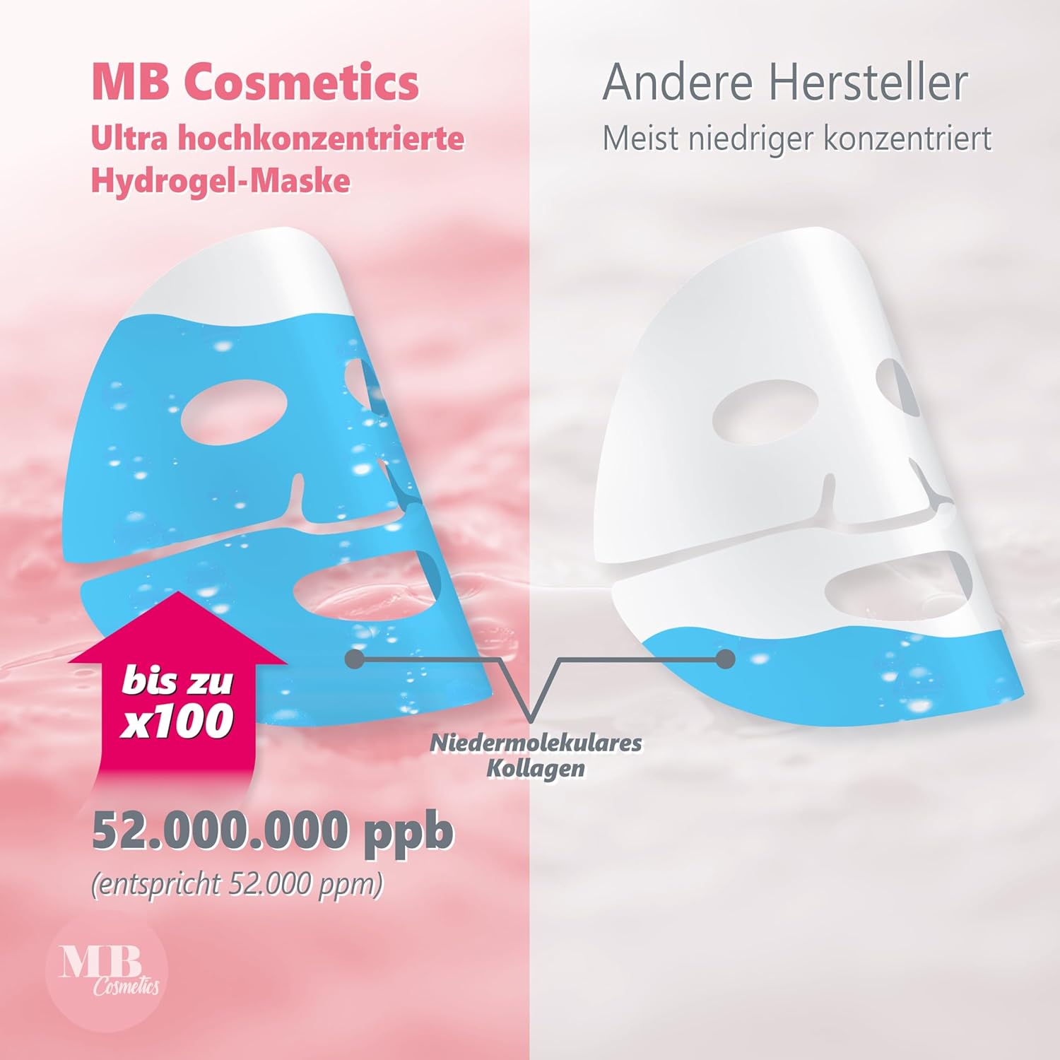 MB Cosmetics collageenmasker – met hyaluron, niacinamiden en probiotica – hydraterend gezichtsmasker van hydrogel voor een direct zichtbare rimpelvermindering. Ultra-sterk geconcentreerd met 52.000 ppm.