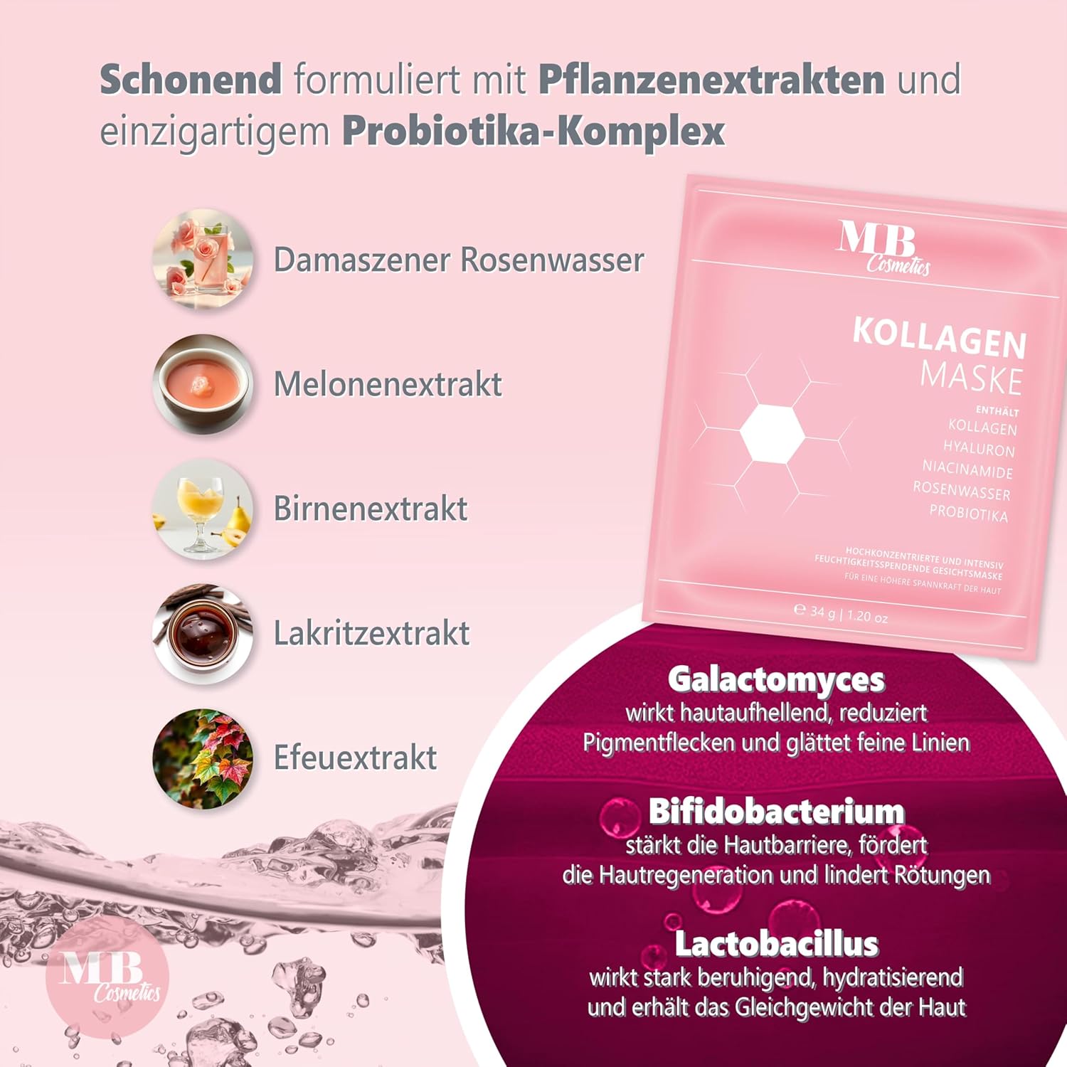MB Cosmetics collageenmasker – met hyaluron, niacinamiden, rozenwater en probiotica – hooggedoseerd hydraterend Deep Facial Mask (52.000ppm) voor een hogere spankracht van de huid, 5 stuks (34g)