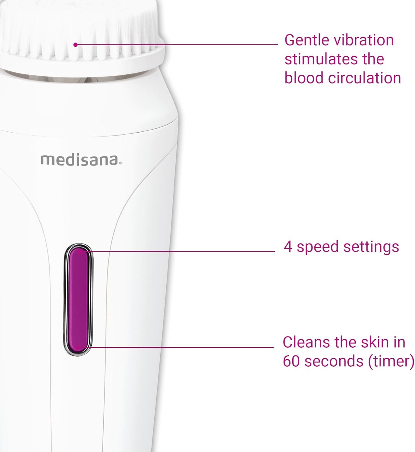 medisana FB 885 gezichtsreinigingsborstel elektrisch, port-diepe reiniging, batterij aangedreven gezichtsborstel met peelingbevestiging, cosmetische spons en 4 snelheden