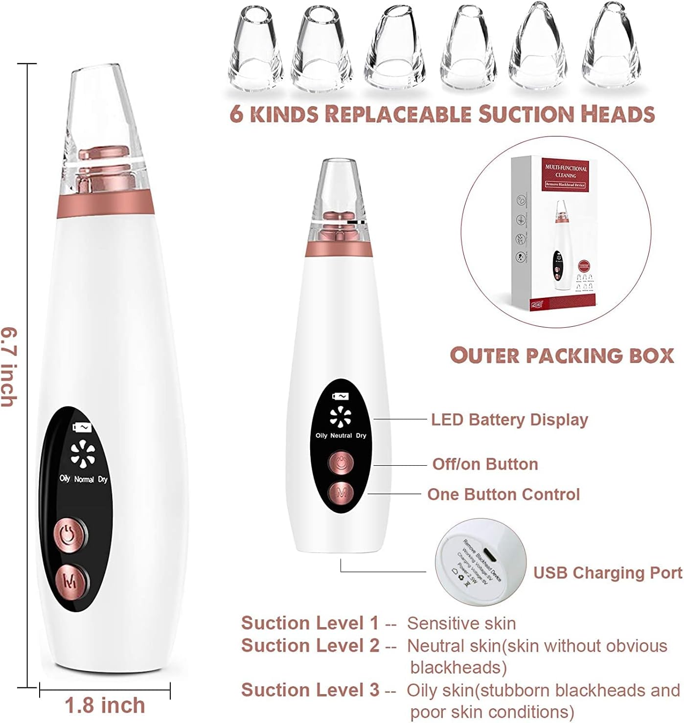 5 VERVANGBARE ZUIGKoppen & 3 VERSCHILLENDE INTENSITEIT NIVEAUSWordt geleverd met 6 zuigkoppen om verschillende huidproblemen op te lossen. De verbeterde mini en kleine zuigkop zijn perfect voor de gevoelige/droge huid. De middelste en normale kop zijn geschikt voor een vette, neutrale en gemengde huid. De ovale kop en de grote ronde kop kunnen poriën krimpen en je huid elastischer maken.