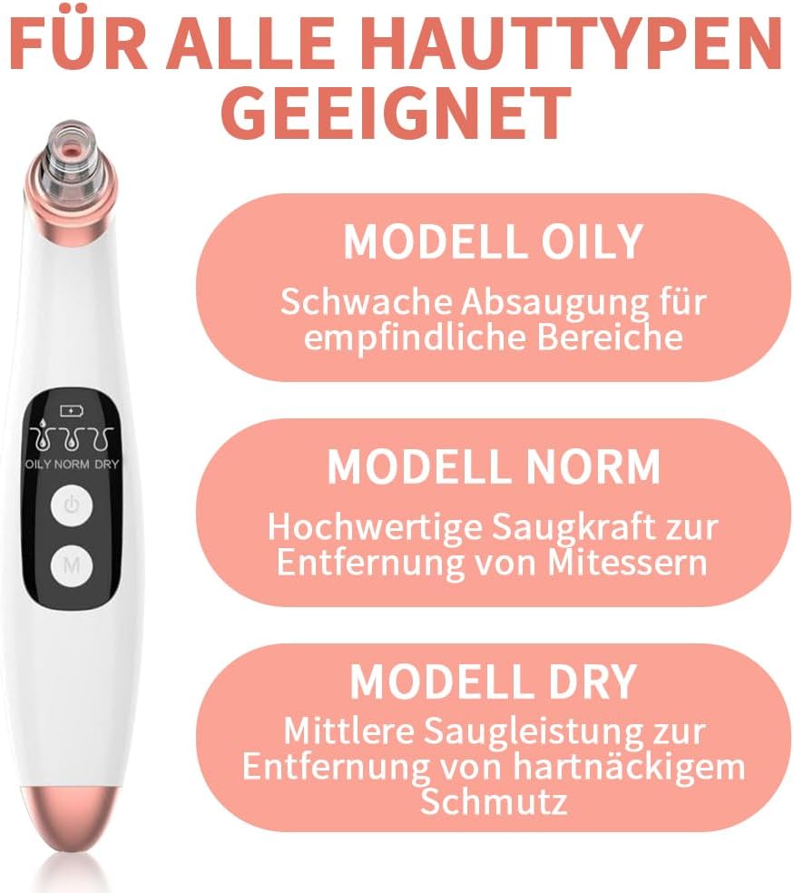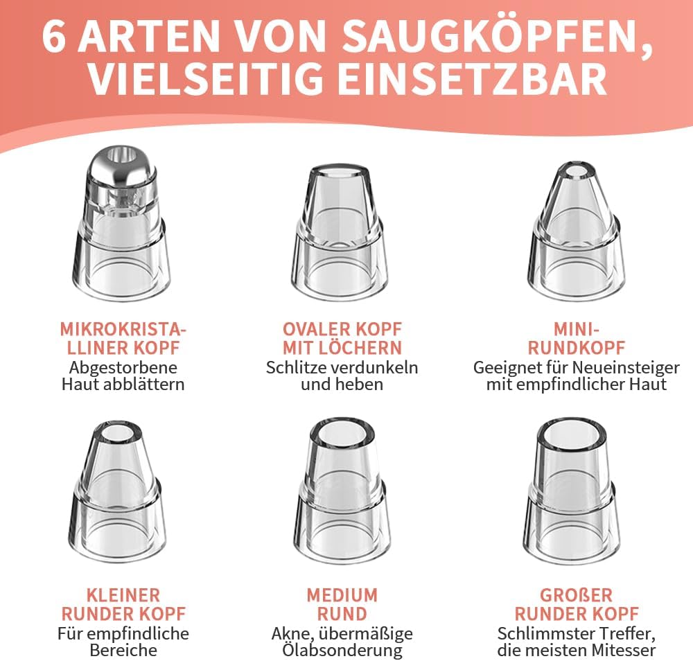 Multifunctionele modus: de mee-eterverwijderaar kan worden ingesteld op basis van je huidtype: 3 modi, niveau 1 voor de gevoelige huid en droge huid, niveau 2 voor gemengde en natuurlijke huid, niveau 3 voor vettige huid. Het wordt geleverd met 6 huidverzorgingskoppen in verschillende vormen om aan je verschillende gezichtsverzorgingsbehoeften te voldoen.