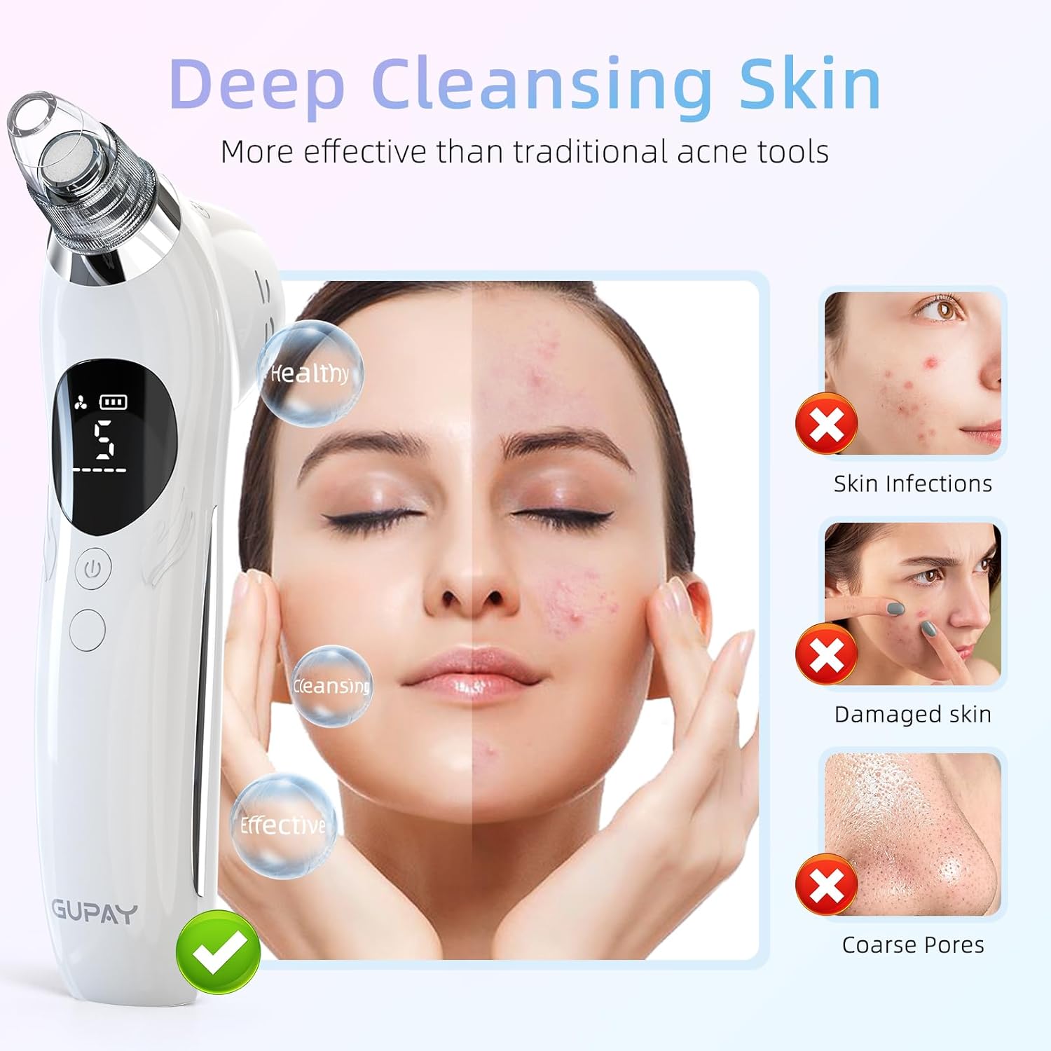 I recently tried the GUPAY Blackhead Remover Vacuum, and my experience has been mixed. The device is easy to use, had a good LED display and the adjustable 5-speed suction levels allow for customization based on skin type. I like that it comes with five different suction heads, each designed for specific skin issues and this wins, over a basic extractor. The USB rechargeable feature is also convenient as I don’t have to worry about replacing batteries.In terms of performance, it does remove some blackheads and helps clear out excess oil, but I found that it works best when used right after steaming my face. If the pores aren’t properly prepped, the suction may not be as effective and the higher you go on the suction levels, it can a bit intense and not be as gentle on the skin so it’s important to use with care as if left in one spot for too long, it can cause some irritation.While the product does what it claims to some extent, it’s not a miracle solution for stubborn blackheads and my results have been varied each time. It’s a decent addition to my skincare routine but I wouldn’t rely on it as a sole method for deep cleaning.