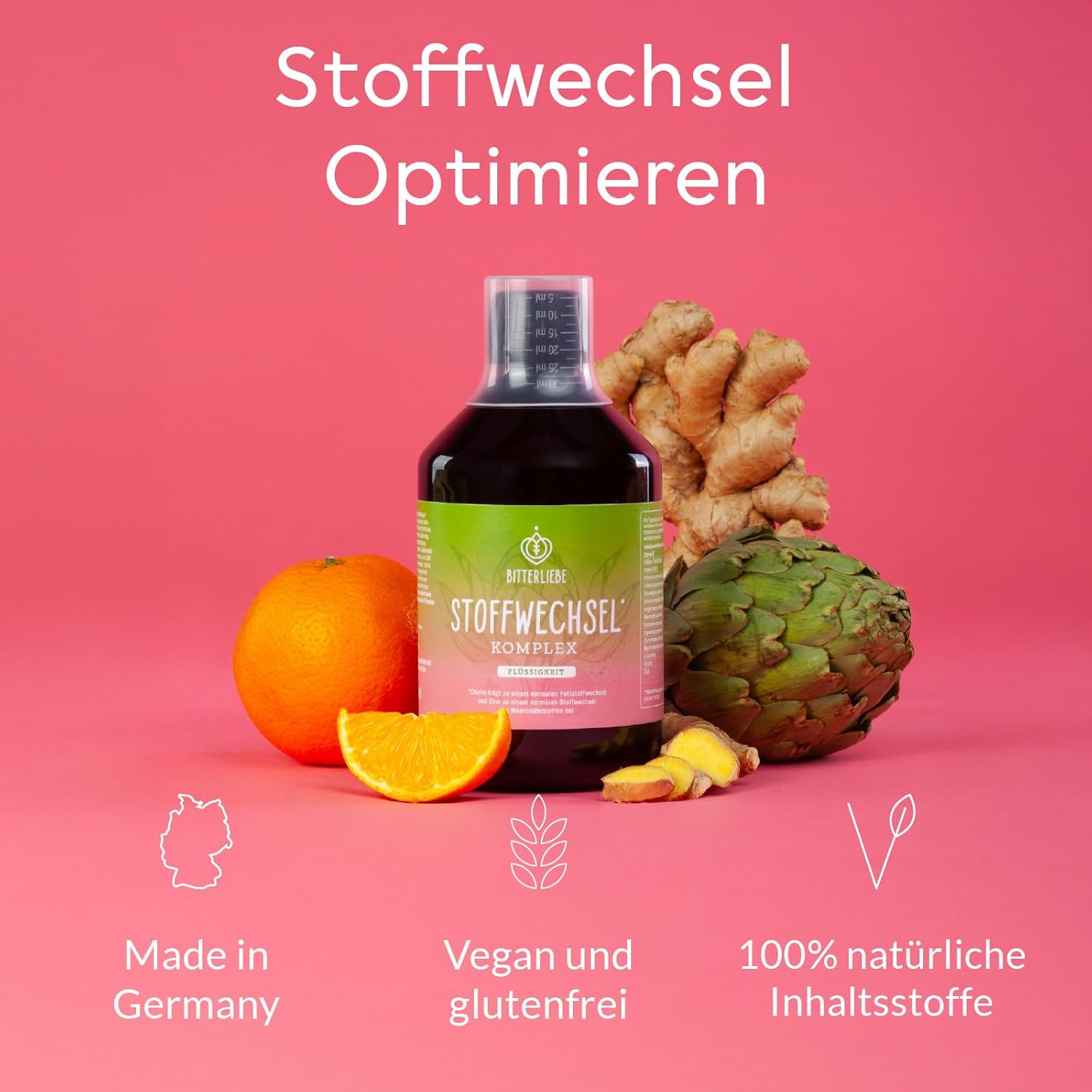 Het Bitterliebe vloeibare stofwisselingscomplex is een innovatieve oplossing, speciaal ontwikkeld om de stofwisseling op natuurlijke wijze te ondersteunen en het afvallen te vergemakkelijken. Deze unieke mix van hoge dosis choline, groene thee-extract en bittere stoffen werkt als een extreem sterke vetverbrander, zodat het vetmetabolisme effectief wordt versneld. De ingrediënten bevorderen de energieproductie en verhogen het welzijn door de nodige vitaliteit. Bittere stoffen beginnen de spijsvertering al in de mond, wat een snelle metabolische stimulatie mogelijk maakt. Dit ondersteunt een uitgebreide metabolische kuur, vermindert het verlangen naar warmte en beïnvloedt de eetgewoonten positief. Het mariadistel artisjok paardenbloem lever complex optimaliseert de leverfunctie en vergemakkelijkt het transport van slakken. Met natuurlijke vetstofwisselingsboosters zoals cynarine uit artisjok kruid, biedt dit complex duurzaam afvallen zonder crash-diëten. Ervaar een energiekick door de synergetische werking van de op elkaar afgestemde plantaardige ingrediënten en verbeter je stofwisseling. Gemaakt in Duitsland en veganistisch, zonder chemische toevoegingen, ondersteunt hij een gezonde en actieve levensstijl. Ideaal voor iedereen die zijn vitaliteit wil verhogen en vervelende vetkussens wil verwijderen. *Bevat zink: draagt bij aan een normaal koolhydraat-, vetzuren en zuur-base-metabolisme, evenals aan een normaal metabolisme van macronutriënten en een normale werking van het immuunsysteem. * Bevat L-carnitine: ondersteunt het mitochondriale metabolisme door vetzuren met lange keten te transporteren en de energievoorziening van cellen te bevorderen. *Bevat choline: draagt bij aan een normaal vet- en homocysteïnemetabolisme en aan een normale leverfunctie. *Bevat groene thee: vermindert de vetopname tijdens de spijsvertering door de catechin EGCG. * Bevat cynarine uit artisjok kruid: bevordert de galafscheiding en ondersteunt de lever- en vetstofwisseling. * Bevat mariadistel-silymarijn: stimuleert de productie van galsap en verlaagt cholesterol en bloedvetwaarden. * Bevat ginsenosiden van ginsengwortel: werkt stimulerend en versterkt het immuunsysteem, heeft ontstekingsremmende eigenschappen en bevordert de stofwisseling. * Bevat paardenbloemwortelflavonoïden: helpt bij spijsverteringsproblemen en stimuleert de stofwisseling. * Bevat curcuminoïden van curcuma: werkt spijsverteringsbevorderend en beïnvloedt de vetstofwisseling door de productie van spijsverteringssappen. * Bevat gemberwortel gemberwortel: stimuleert de productie van speeksel en maagsappen en stimuleert de stofwisseling.
