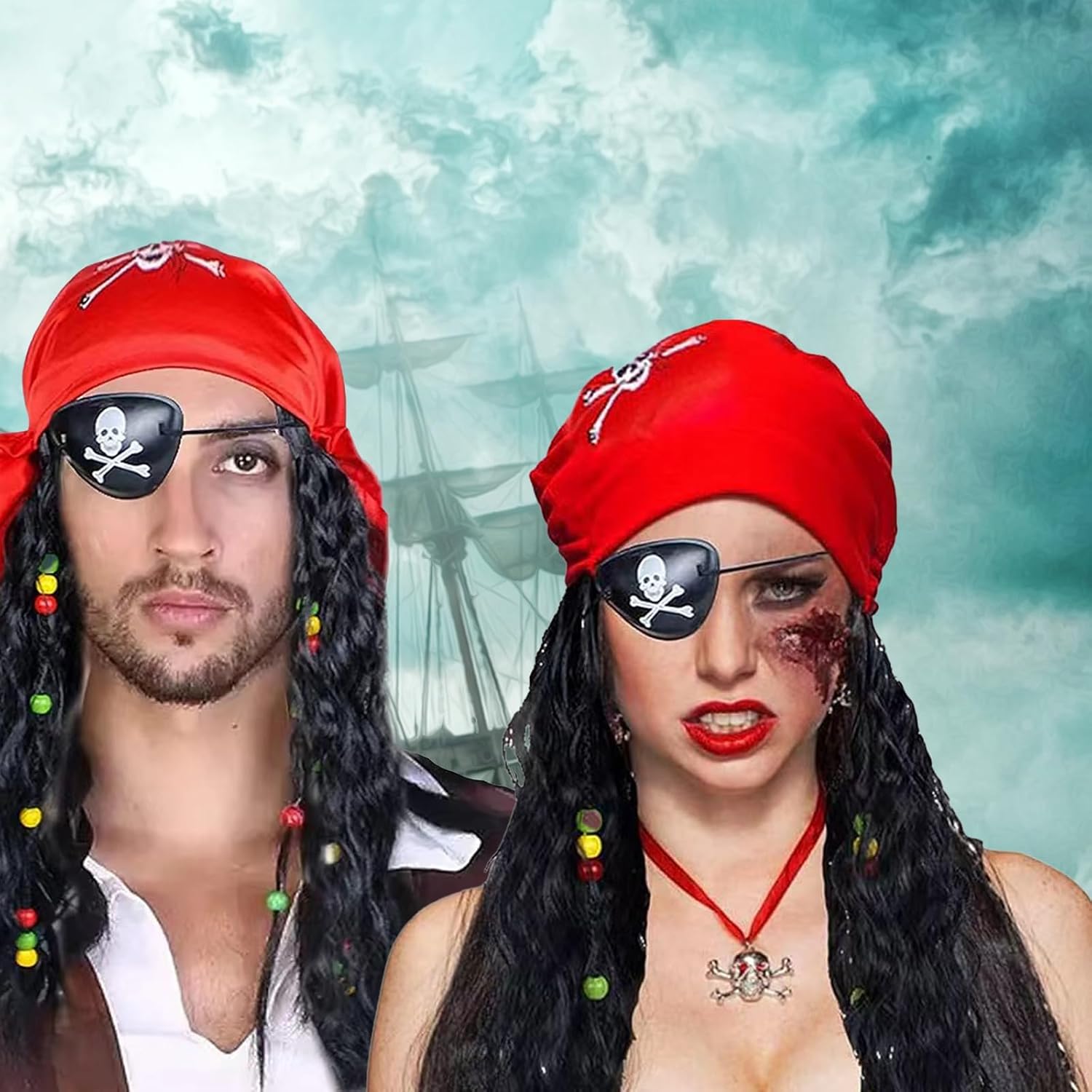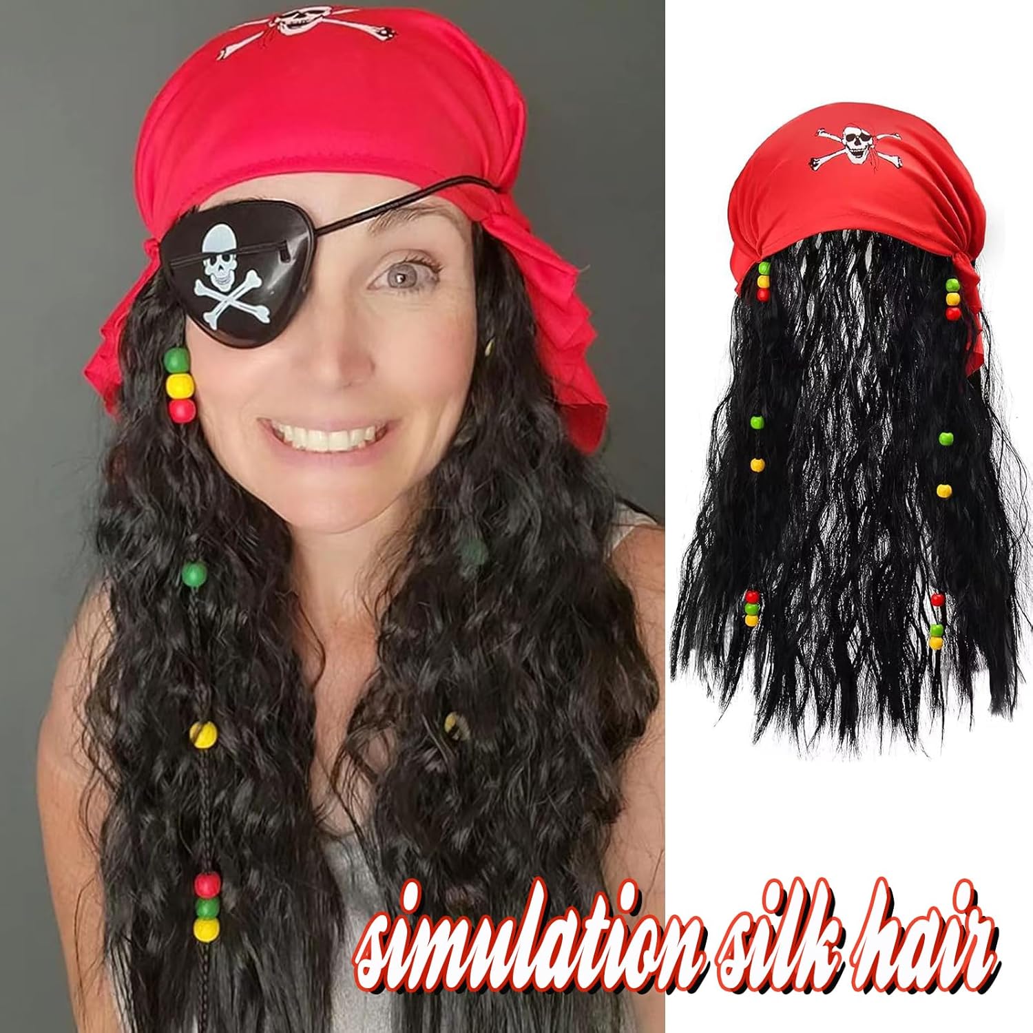 MFCGHXR 3 Pirate Braid Hat Eye Mask Set 3 in 1 Pirate Captain Wig Wig Skull Bandana Wig Eye Mask (zwart)