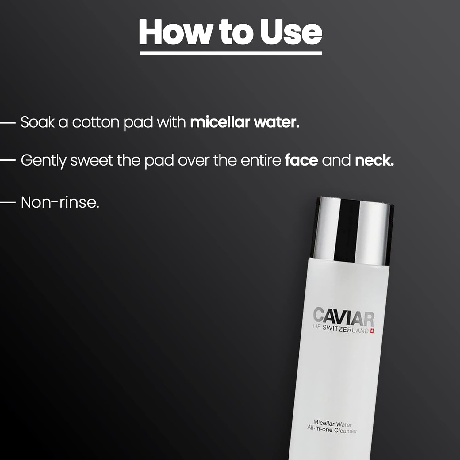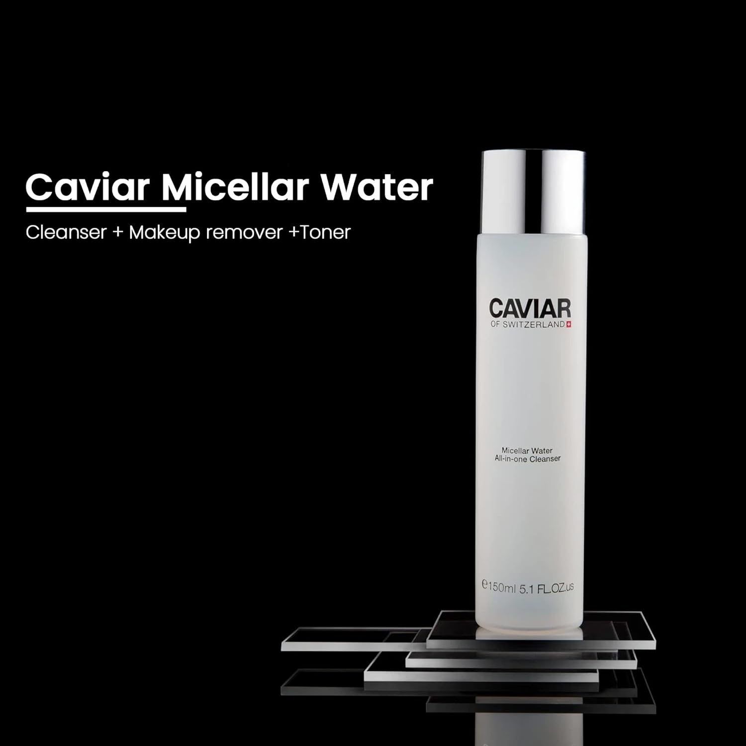Micellar Water is a skin care product that removes makeup and cleanses the skin, without rinsing it off. It is intensive enough to remove eye makeup, but also contains very gentle yet effective skin cleansers. The micellar water is suitable for all skin types. Its rich formula protects the skin from water loss and activates the natural protection mechanisms. It moisturizes and helps to counteract the three signs of sensitive skin: redness, feeling of tension and dryness. In addition, it protects against environmental influences, improves cell renewal and revitalizes the skin’s natural defenses. The Micellar Water is the ideal starting product for using other Caviar or Switzerland products.