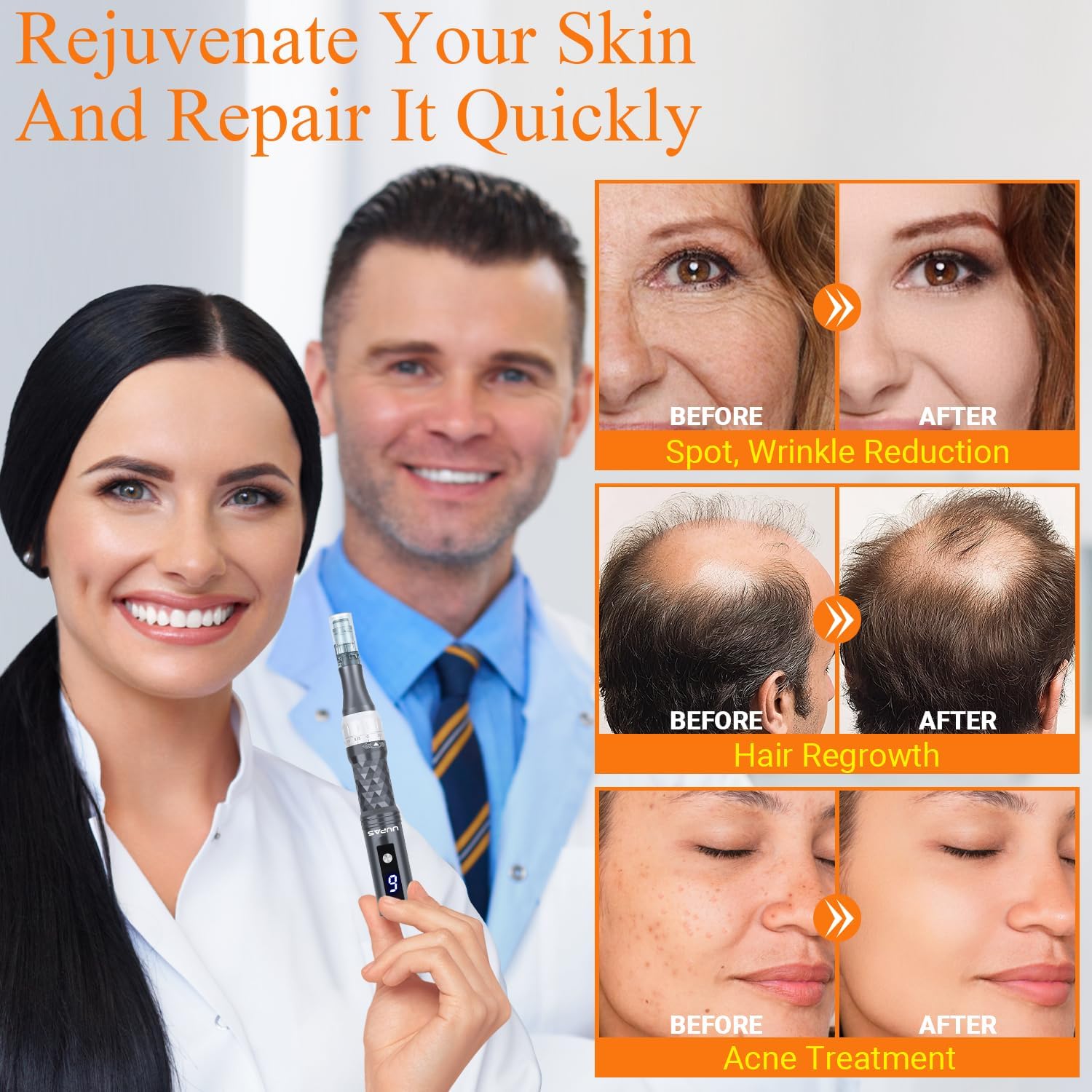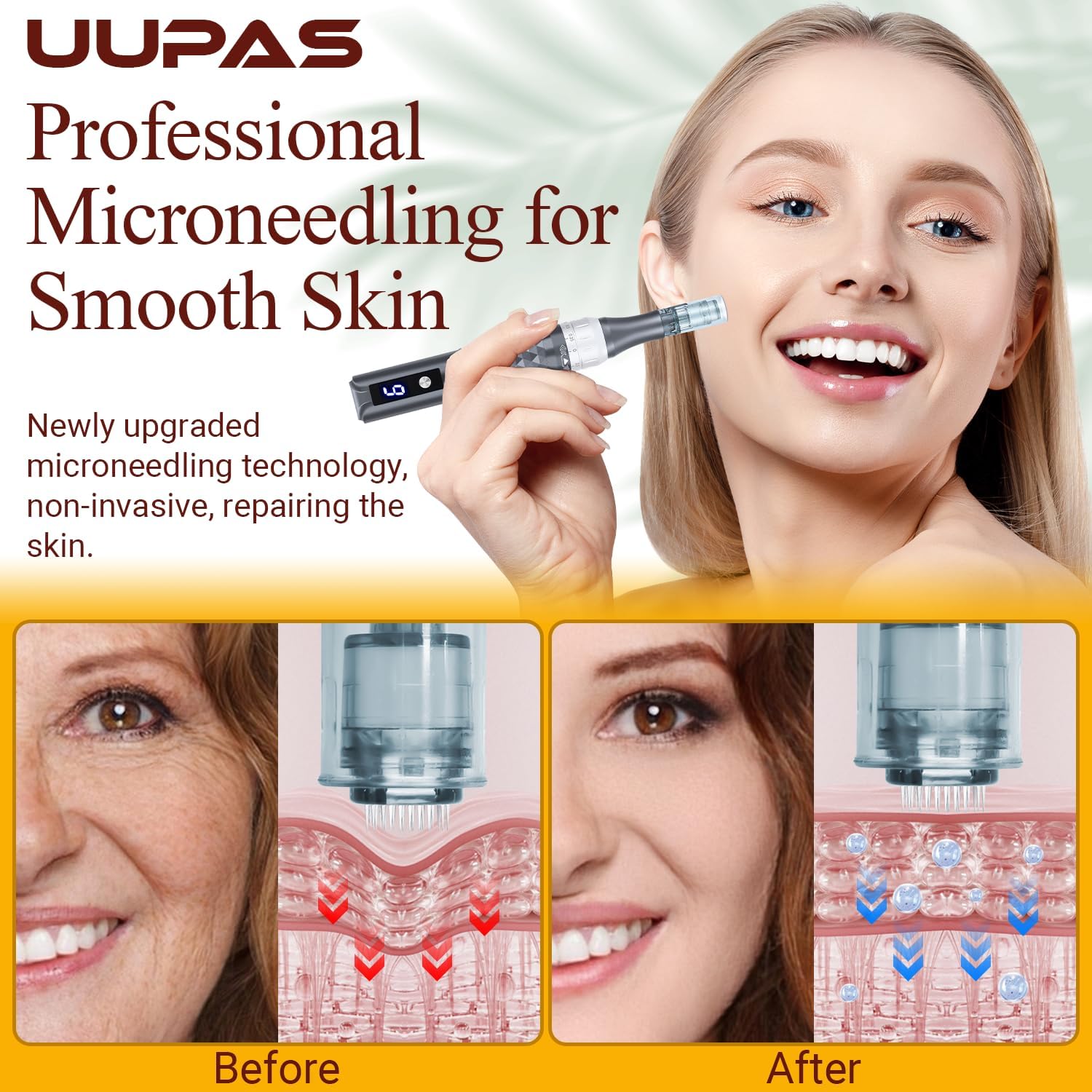 Efficiente Huidverzorging: De UUPAS Microneedling pen maakt gebruik van de nieuwste microneedling technologie om de huid snel en effectief te verbeteren. Het stimuleert collageen, verwijdert acne rimpels, krimpt poriën, verlicht vlekken, haargroei en meer