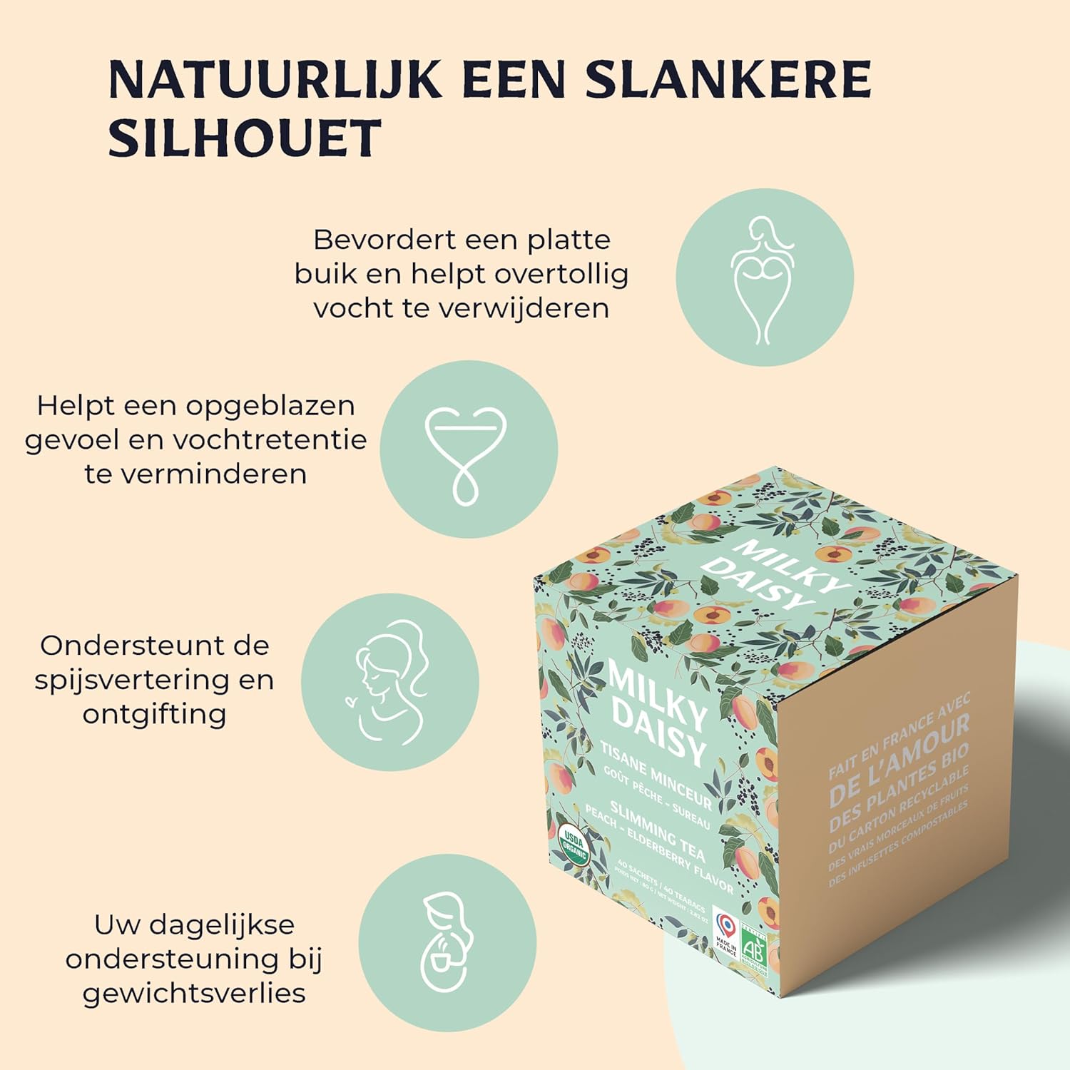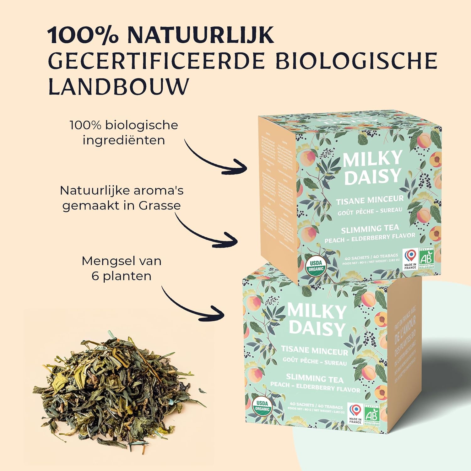 Milky Daisy – Biologische Afslankthee – Smaak van Perzik en Vlierbloesem – Vocht afdrijvend en Afslankend, Cafeïnevrij – 40 Theezakjes
