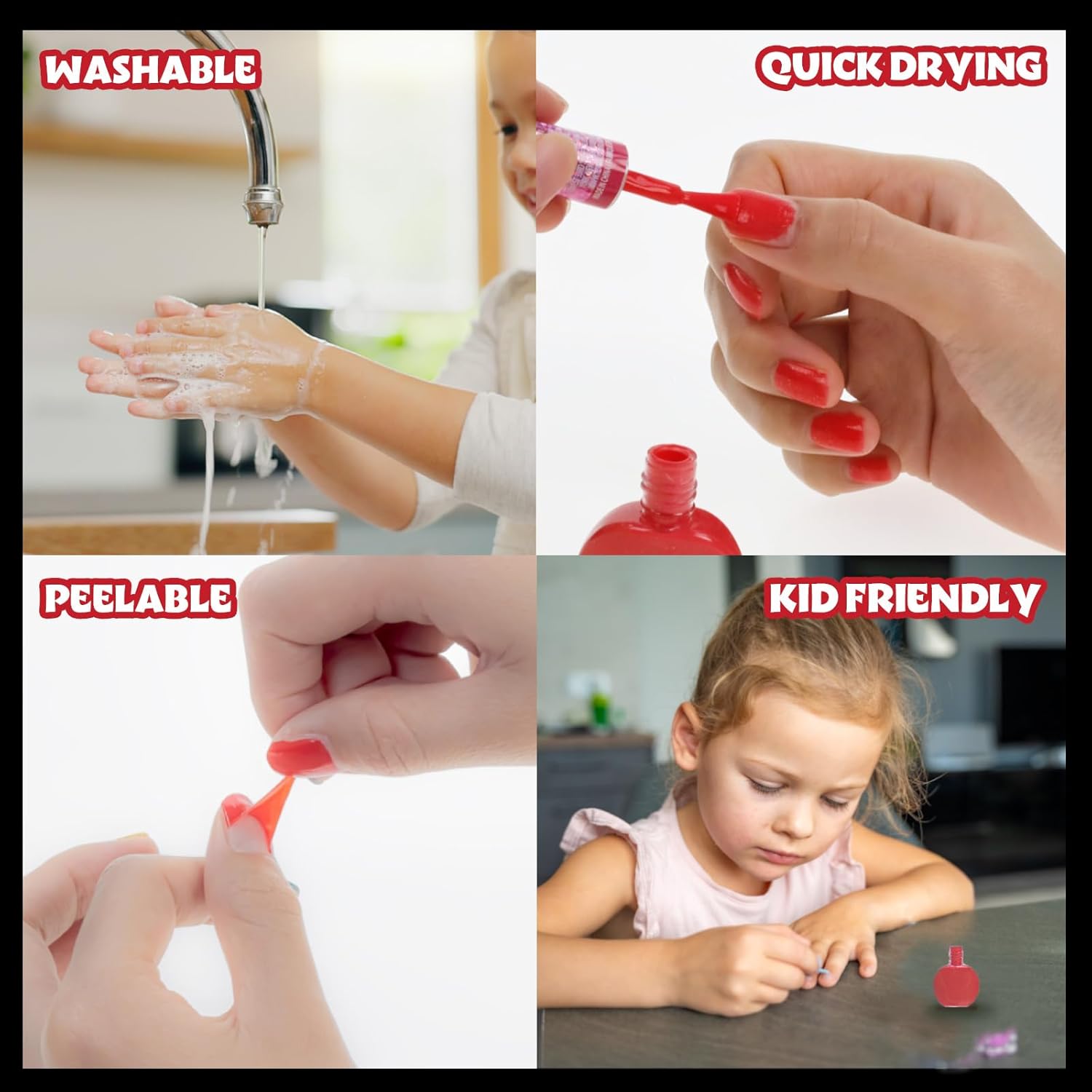 DISPLAY AND NON-TOXIC : Our nail polishes are water-based, peeled off and smell of gum, making them safe and easy to use. Simply wash your nails with water and remove the dried nail polish from your nails without exposing your child to harmful fumes and chemicals from standard nail polish removers.