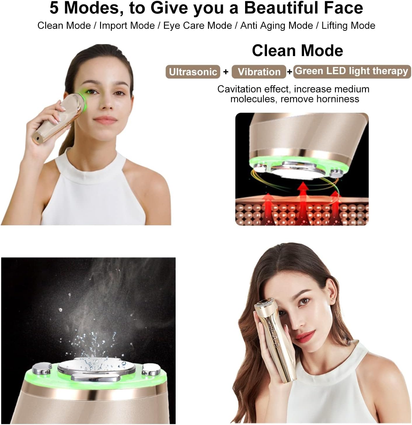 5-in-1: dit geavanceerde ultrasone apparaat voor radiofrequentie voor het gezicht biedt 5 schoonheidsbehandelingen: ultrasoon, gezichtsmassage, radiofrequentie, microstroom en led-lichttherapie. De bediening is eenvoudig en elke modus heeft verschillende functies. Het hele proces kan de huid strakker, stralender, elastischer en gezonder maken. Het wordt aanbevolen om het met geleidende gel of vochtinbrengend serum te gebruiken.