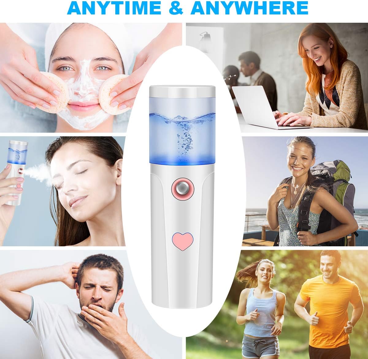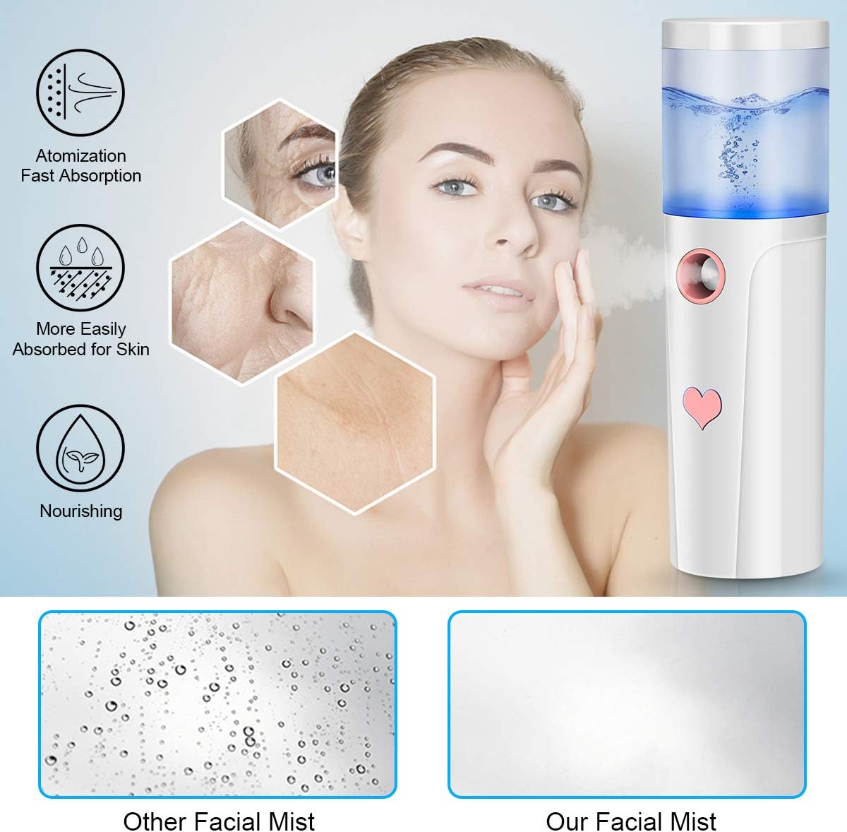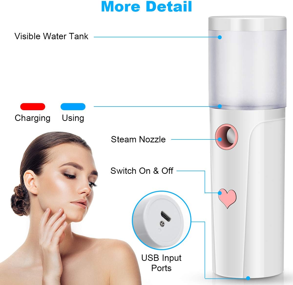 Overzicht van het product: Mister, draagbare Cool Mist Steamer Handige mistsproeier for gezicht Hydraterende en hydraterende Mini USB oplaadbare Mister Travel Face Luchtbevochtiger Verstuiver met 20 ml watertank /89