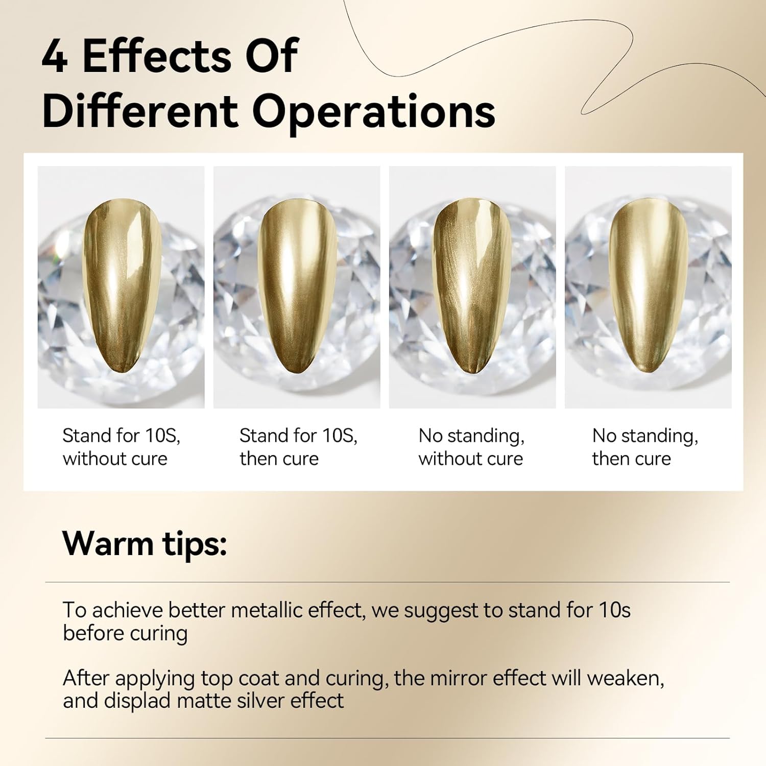 Charming metallic shine: 3D mirror metal glossy drawing UV nail polish has a metallic shine. Ultra-fine powder provides an excellent chrome mirror finish. Not only for drawing lines, patterns and decorations, but also for full painting, French manicure and 3D nails