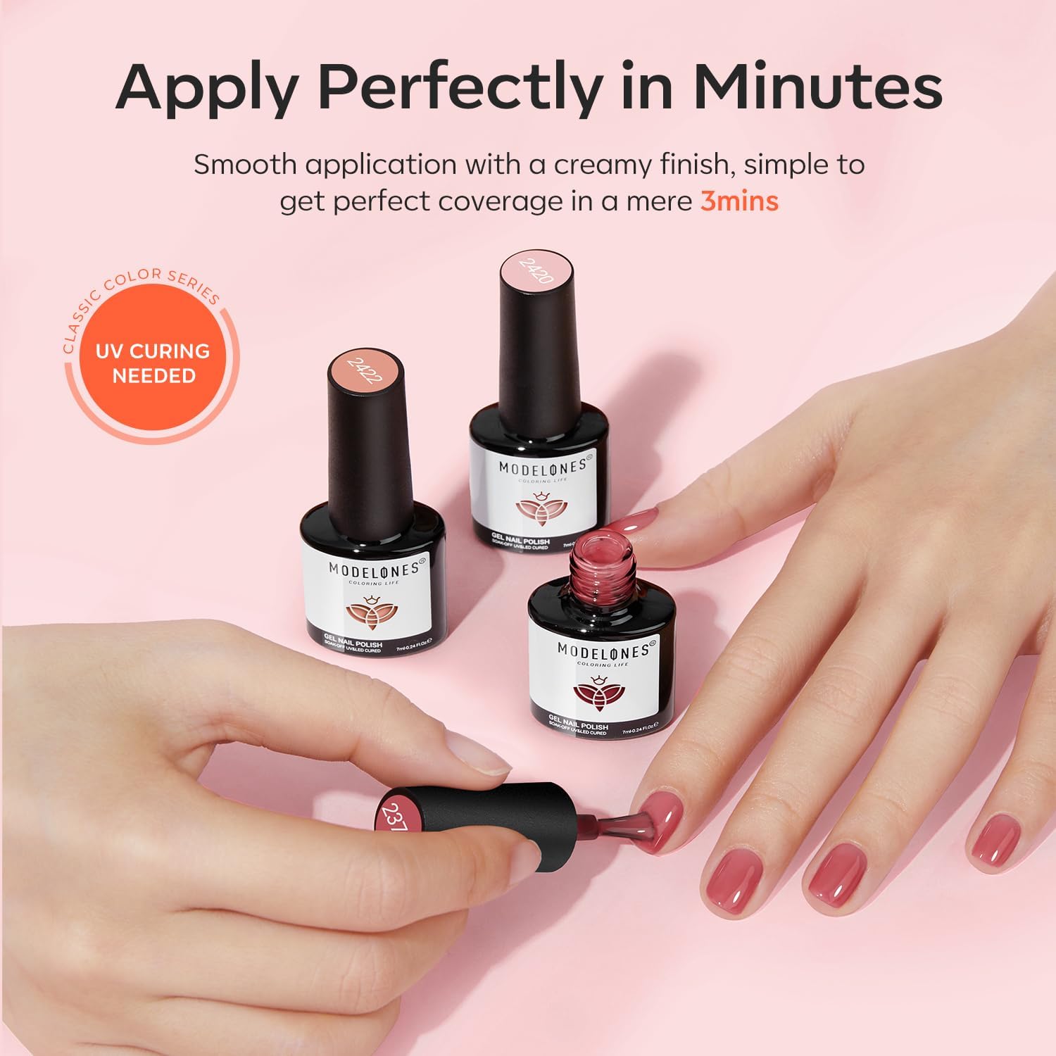 Easy Application and Good Toughness: modelones UV Gel Semi-Permanent Set has excellent color development thanks to the smooth formula of the gel nail polish set and the unique, easy-glide brush. One application ensures even coloring, two applications ensure better results