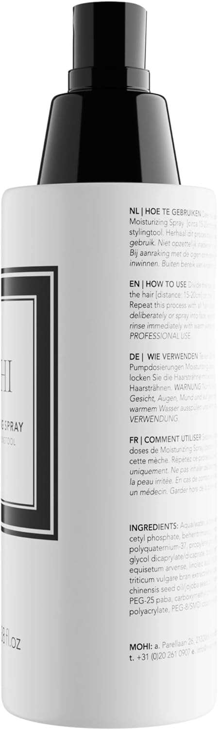 De MOHI Moisturizing Spray is speciaal ontworpen voor haar dat wordt behandeld met stijltangen, krultangen en föhns. Het beschermt het haar niet alleen tegen hitte, maar voedt het ook optimaal. Deze hydraterende spray is het ideale product om te gebruiken met stylingtools, omdat het het haar beschermt en het extra zachtheid en glans geeft van wortel tot punt. Verrijkt met essentiële ingrediënten zoals antioxidanten, vitaminen en arganolie, biedt dit serum haar dat voller, sterker en gezonder is met een indrukwekkende glans. Wanneer aangebracht tijdens het stijlen of krullen, krijgt het haar optimale zorg en voelt het zijdezacht aan.